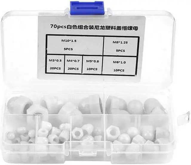 Specification:Material: NylonType & Quantity:M3*0.5 20PCSM4*0.7 20PCSM5*0.8 10PCSM6*1.0 10PCSM8*1.25 5PCSM10*1.5 5PCSWeight: 63g / 2.2oz (approx.) Features: Made of nylon material, these acorn nuts are sturdy and durable. It is not easy to slip when turning screw with wrench, mainly used for rough and simple components. Acorn nuts can prevent nuts from getting loose and falling off. It can be used as high strength fasteners for machinery, furniture, vehicles, etc.