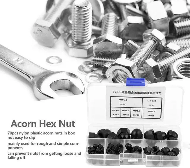 Specification:Material: NylonType & Quantity:M3*0.5 20PCSM4*0.7 20PCSM5*0.8 10PCSM6*1.0 10PCSM8*1.25 5PCSM10*1.5 5PCSWeight: 63g / 2.2oz (approx.) Features: Made of nylon material, these acorn nuts are sturdy and durable. It is not easy to slip when turning screw with wrench, mainly used for rough and simple components. Acorn nuts can prevent nuts from getting loose and falling off. It can be used as high strength fasteners for machinery, furniture, vehicles, etc.