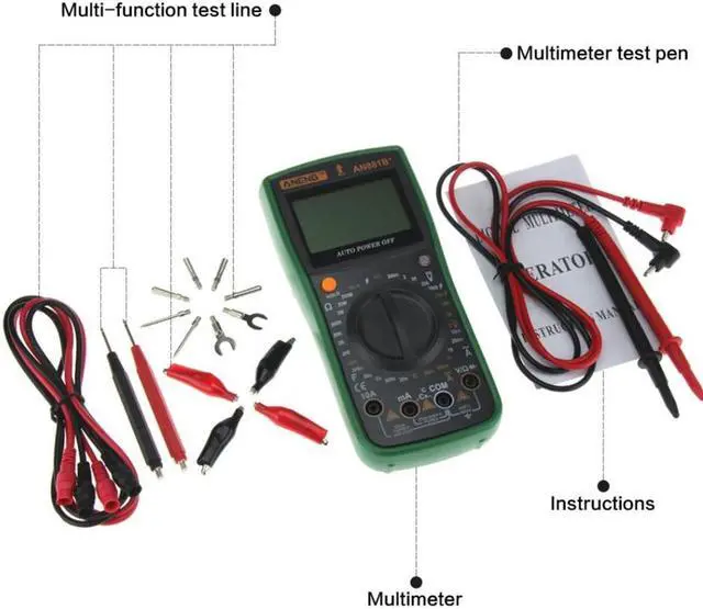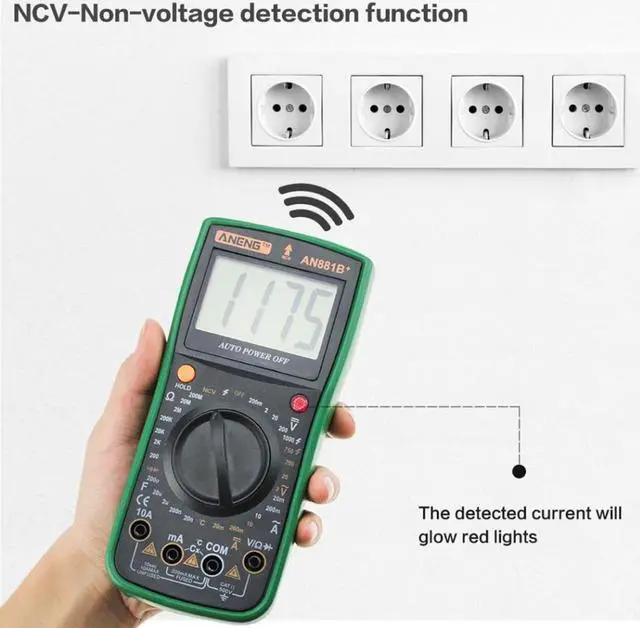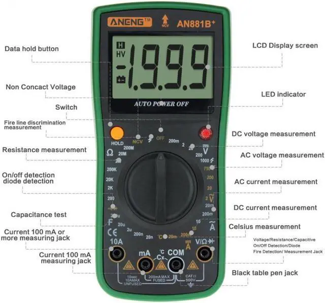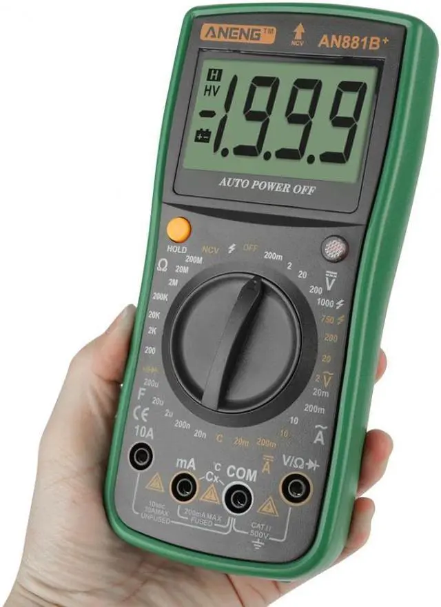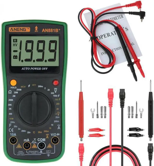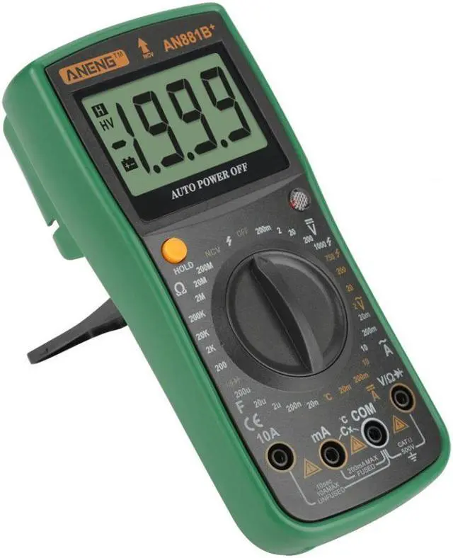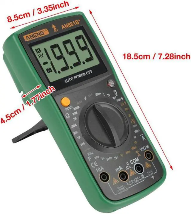 Specifications:Brand: ANENGModel: AN881B+Operating Mode: handedMeasuring Capacitance Range:2nF/ 20nF/ 200nF/ 2uF/ 20uF/ 200uFMeasuring Resistance Range:200/ 2K/ 20K/ 200K/ 2M/ 20M/ 200M/ 2000MOperating Temperature:0 - 40 DC Voltage: 200mV / 2V / 20V / 200V / 1000VAC Voltage: 200mV / 2V / 20V / 200V / 750VAC Current: 2mA / 20mA / 200mA / 20ADC Current: 2mA / 20mA / 200mA / 20ATemperature Sensor: -20~1000Non-contact voltage test: Alternating current 90V-1000VMeasuring Inductance Range: NoDIY Supplies: ElectricalDimensions: Approx. 185*85*45mm/7.28*3.35*1.77inDisplay Type: Digital DisplayFinding Fire Wire: YesOn-off detection: YesTriode measurement: YesBuzzer: YesBattery: 1 x 9V 6F22 Battery (NOT included)Weight: Approx. 389g Features: This multimeter can accurately measure AC and DC voltage, AC and DC current. Displays values on a digital screen to help you control real-time condition of testing object. It can also be used for resistance and temperature measurement, continuity test and diode test. Full function protection, anti-high voltage circuit design. Indispensable tool meter for electrician measurement.