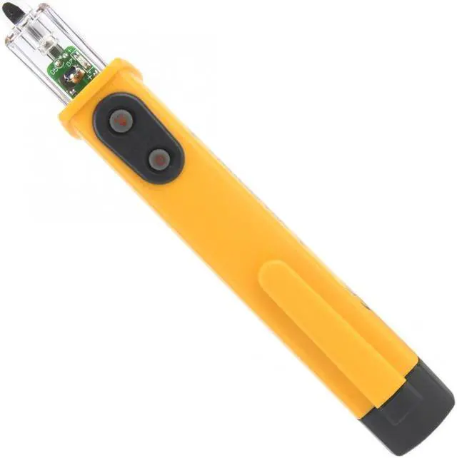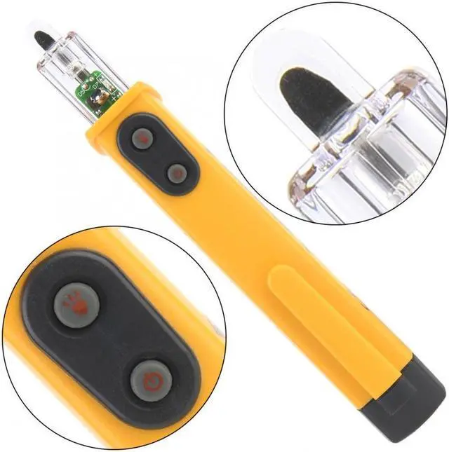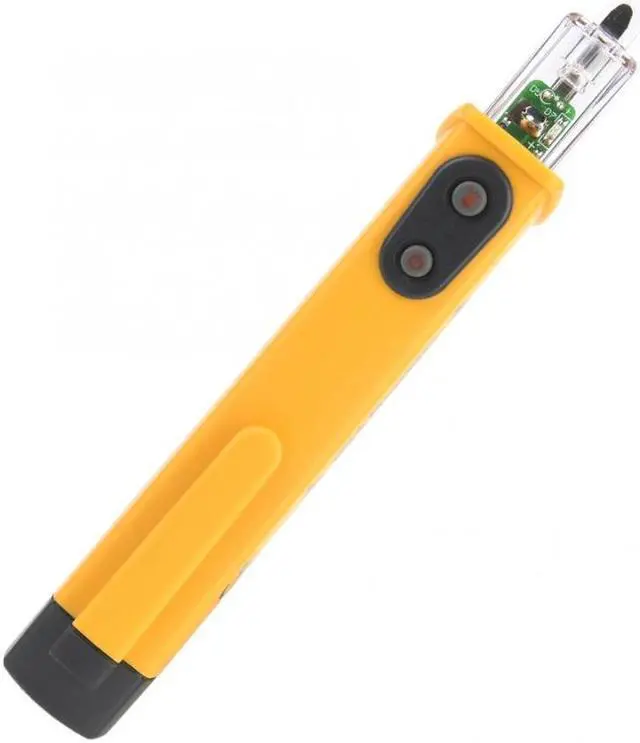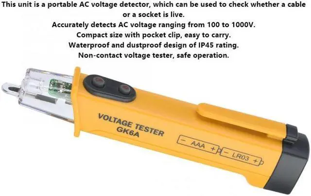 Specification:Model: GK6AAlarm:Vibration and red light Measuring Range:100~1000VAC,at 50/60Hz Waterproof & Dustproof: IP45 Battery: 2* 1.5V battery (NOT included)Size: 152 * 32mm / 6 * 1.3in Features: This unit is a portable AC voltage detector, which can be used to check whether a cable or a socket is live. Accurately detects AC voltage ranging from 100 to 1000V, distinguishing the voltage with LED light and vibration. Durable ABS plastic resin ensures a compact build and its pocket clip allows easy carry. High efficient. You don't have to call a professional electrician nor make contact with the wire just to know whether electricity runs through it. This device would determine whether there is some form of electricity running through the wire without you actually needing to touch it. Ensuring your overall safety. Waterproof and dustproof design of IP45 rating. Non-contact feature ensures a safer application. Equipped with convenient torch light. The LED torch allows operation even on dark corners.