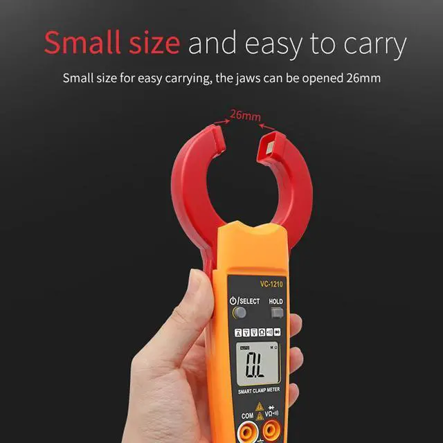 Specification:Model:VC-1210Color: yellow & redSampling speed:3 times per secondBattery type: 2 x 1.5V AAA battery( not included )DC voltage: 2V/20/200V (0.5%+1)600V (1.0%+5)DC voltage resolution: 1mV/10mV/100mV/1VAC voltage range: 2V/20/200V (1.2%+3)600V (1.2%+8)AC voltage resolution: 100mV/1VAC current: 2A/20A (2.5%+10)200A/400A (2.0%+5)AC current resolution:1mA/10mA/100mA/1AResistance: 200/2k/20k/200k/2M/20M (1.5%+3)Resistance resolution: 0.1/1/10/100/1k/10kDiode test:yesData hold:yesContinuity buzzer:yesAuto power off:yesLow power indication:yesItem size:172 x 60 x 25mmItem weight: 193g Package Information:Package Size: 250 x 120 x 40mm/9.84 x 4.72 x 1.57inPackage Weight: 387g/13.65ozGeneral Box Package Features:1.Multifunctional: can measure AC/DC voltage, AC current, resistance, continuity, diode.2.Intelligent:low power indication,auto power off.3.Safe and reliable,easy to operate.4.Convenient to use: with LCD display and data hold function,convenient to read data.5.More advantages:buzzer sounds,data hold,quick response,portable design,high accuracy. Description:1.Portable design,easy to operate.2.Multifunctional,can measure AC/DC voltage, AC current, resistance, continuity, diode.3.It is a stable, high reliability digital clamp meter and is an ideal tool for laboratories, factories, radio enthusiasts and families.