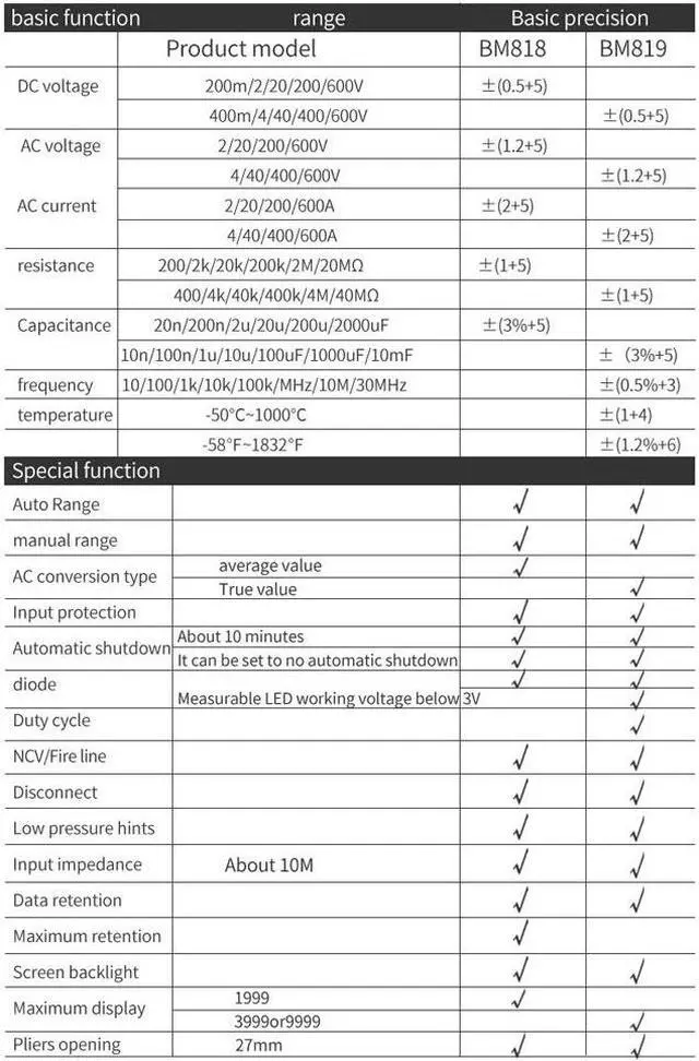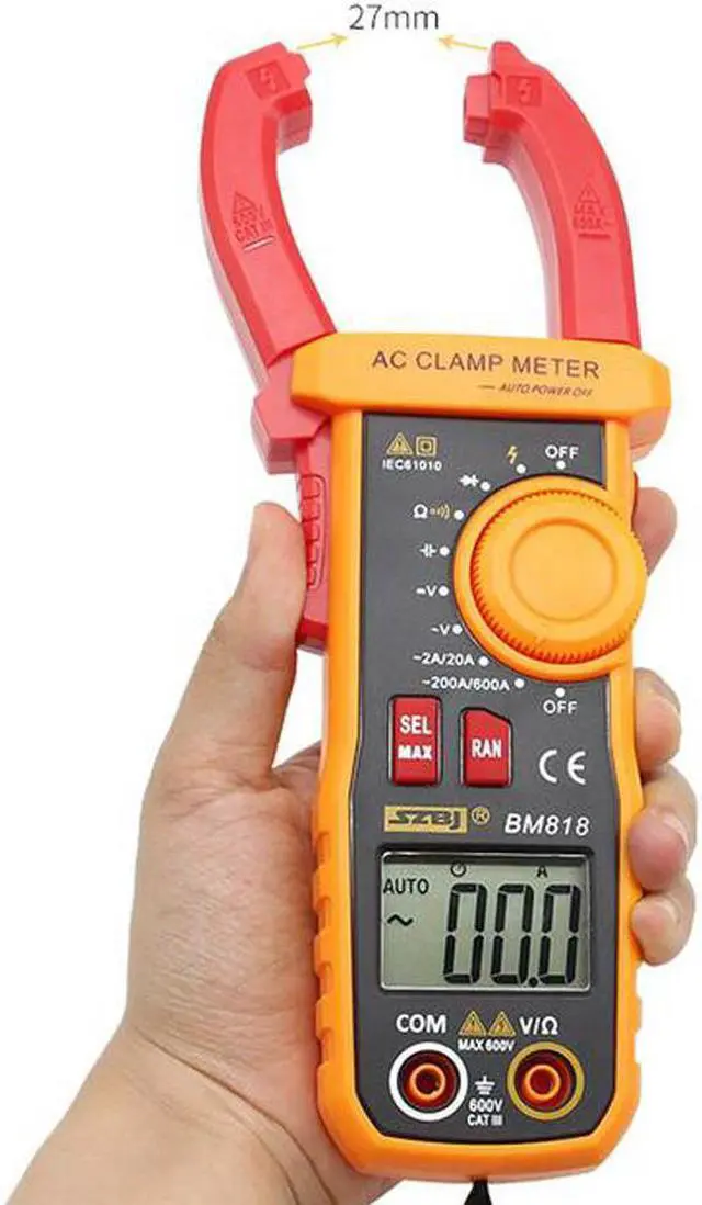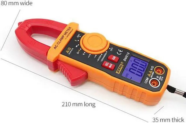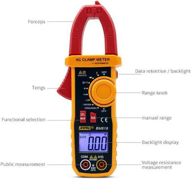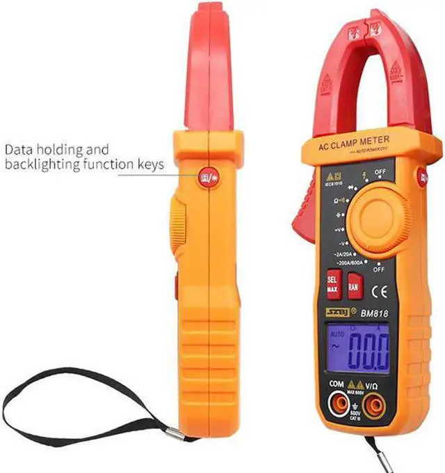 BM818 Ammeter ACV/DCV ACA Auto Range Measurement of Large Capacitance NCV Digital Clamp Meter 1. automatic range measurementDCV:200m/2/20/200/600V,ACV:2/20/200/600V,ACA:2/20/200/600A,Resistance: 200 /2k/20k/200k/2M/20M Omega.Capacitance: 20n/200n/2u/20u/200u/2000uF2. can accurately measure the AC current of AC20mA to 600A3. the capacitance value below 2000uF can be accurately measured and the measuring speed is fast.4. use NCV induction head to judge phase line to accurately measure current.5. has the function of diode and short circuit beep alarm The 6. backlight is easy to read in weak light environment.7. can measure the maximum value of voltage and current8. has a readable retention function.9. there is a manual range function10. automatic shutdown function can be set up or not.
