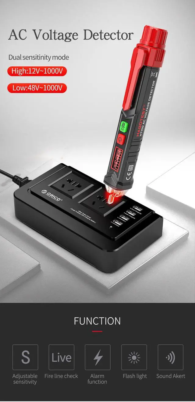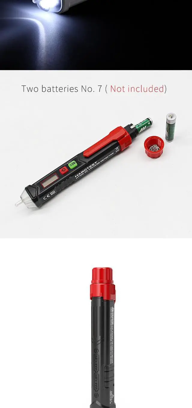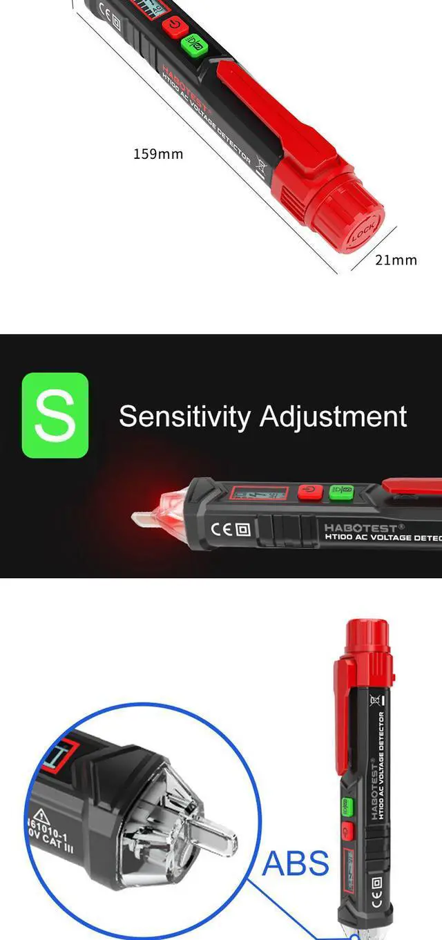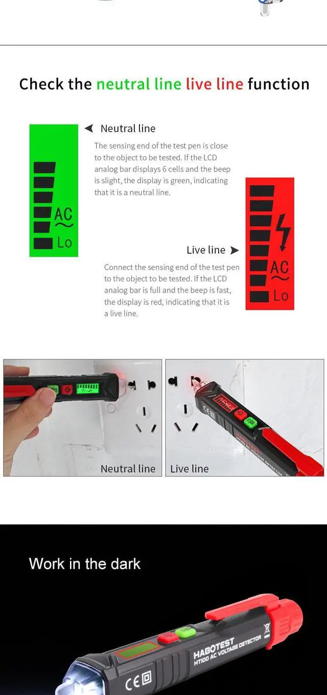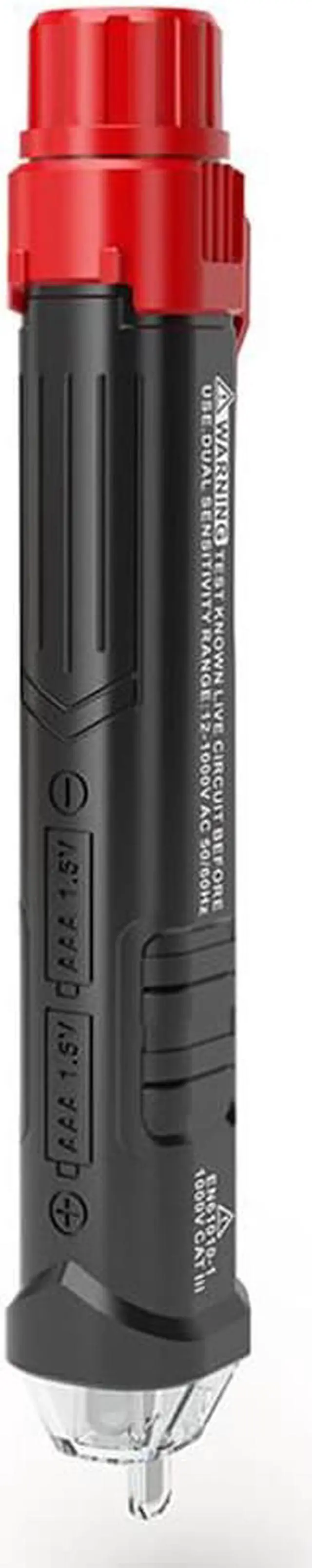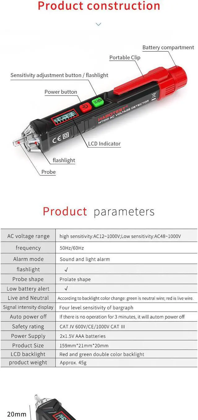 Display Bargraph Range of voltage detection high sensitivity:AC12~1000V;Low sensitivity:AC48~1000V frequency 50/60Hz Alarm mode Sound and light alarm Probe shape Prolate shape Backlight Red and green double color backlight Live and Neutral According to backlight color change: green is neutral wire; red is live wire. Signal intensity display Four level sensitivity of bargraph Signal intensity indication method sound from slow to fast;backlight from green to red;bargraph from low to high Flashlight Yes. Auto power off No operation, no sensing signal will shut down automatically in about 3 minutes. Low-battery indication Power Supply 2x1.5V AAA batteries Weight Approx. 45g Size 155mm x 20mm x 20mm Safety rating EN61010-1,-2-030;EN61326-1,CAT III 1000V Dual sensitivity mode (12~1000V & 48~1000V) Self-test function when power on (beep and red light) LCD screen indicator (battery low, 4 level of sensitivity, AC signal) Low power consumption