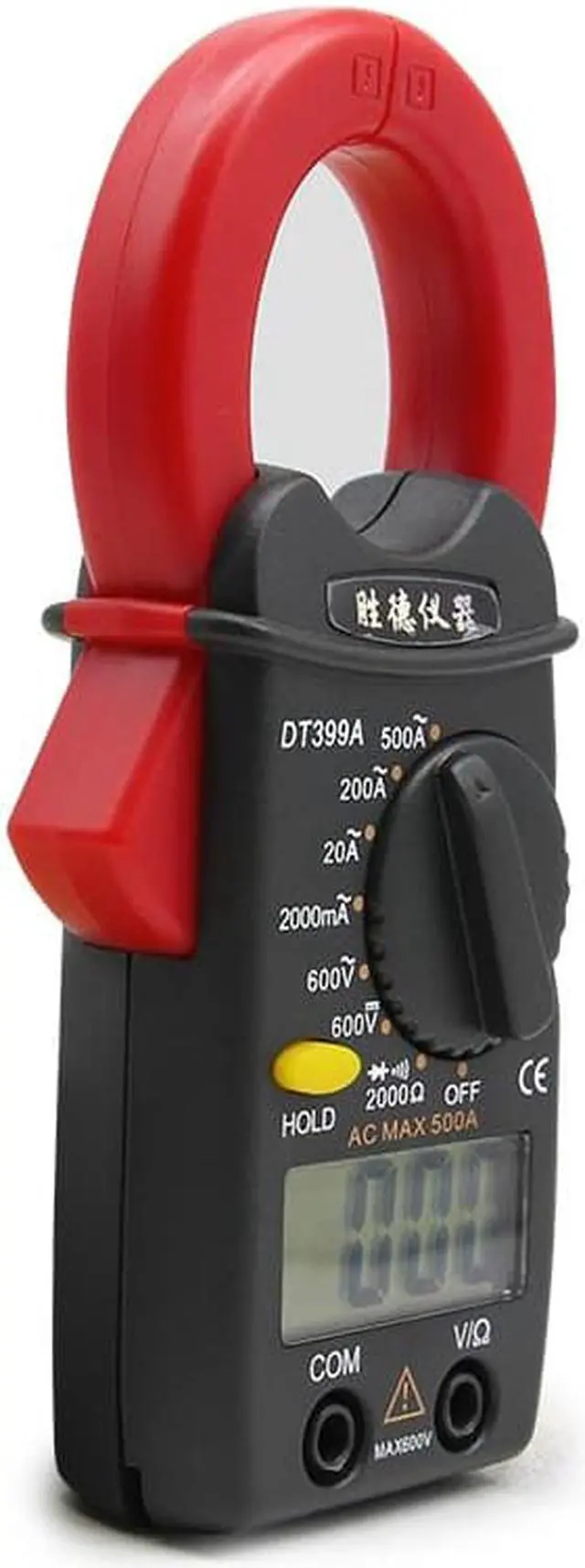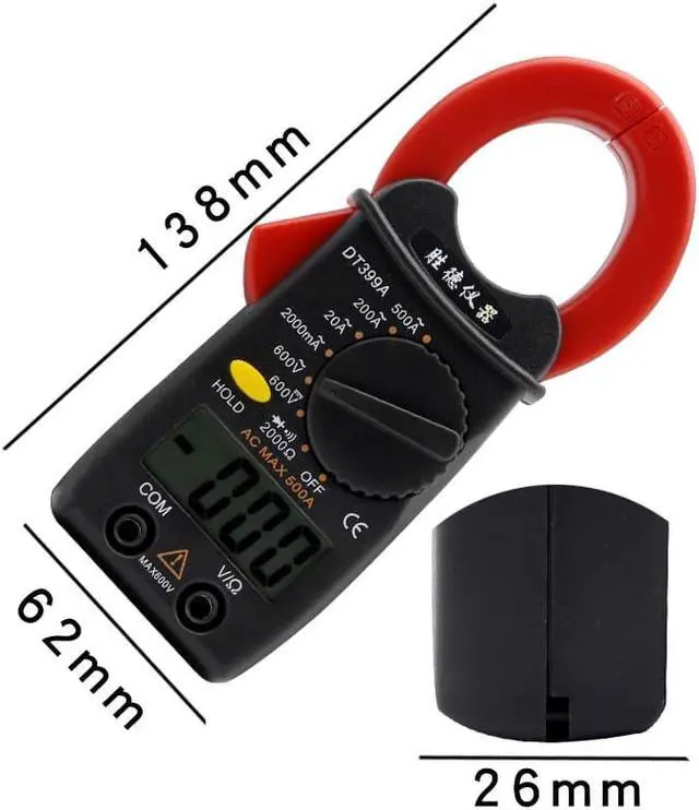 DT399A Digital Clamp Meter Mini Ammeter Clamp Multimeter Small Current Meter Voltage Current Resistance Tester Basic function Range Precision Resolution DC V 200MV 0.5%+4d 0.1MV 2V 1MV 20V 10MV 200V 100MV 600V 1.0%+6d 1V AC V 2V 0.8%+10d 1MV 20V 10MV 200V 100MV 600V 1.0%+10d 1V 200 0.8%+5d 0.1 2K 0.8%+4d 1 20K 10 200K 100 2M 1K 20M 1.2%+4d 10K AC A 2A 3.0%+8d 0.001A 20A 2.5%+8d 0.01A 200A 2.5%+8d 0.1A 500A 3.0%+10d 1A Special function Resolution Description Diode 1MV Open circuit voltage: 1.4V Forward voltage drop is 0.5~0.8V On-off test 0.1 The buzzer sounds below about 50 Overload protection yes General characteristics MAX display 1999 test method Double integral A/D conversion Conversion rate 3 times / sec Overrange display The highest digit displays "OL" Low voltage Power symbol appearsabout 2.4V Clamp open 32mm Battery 1.5V AAA*2(NOT include) Size 138mm*62mm*26mm Weight About 140g