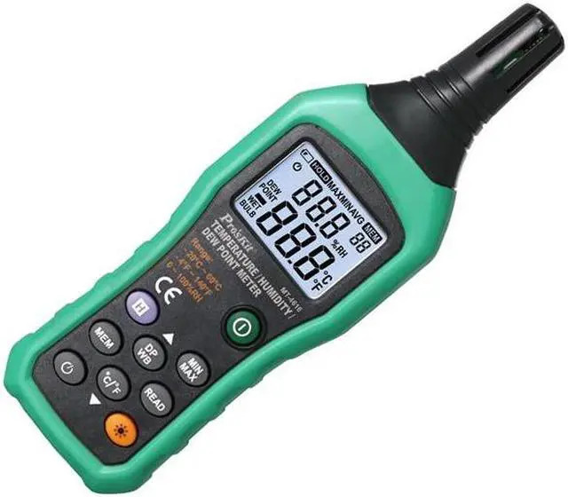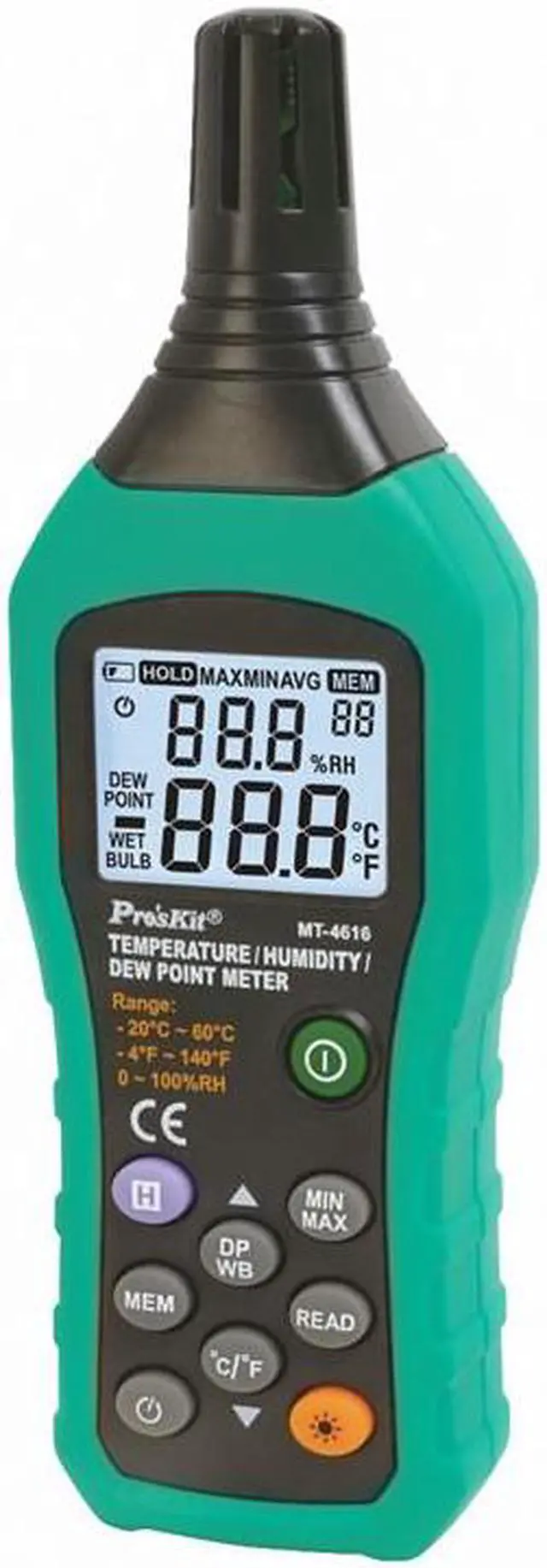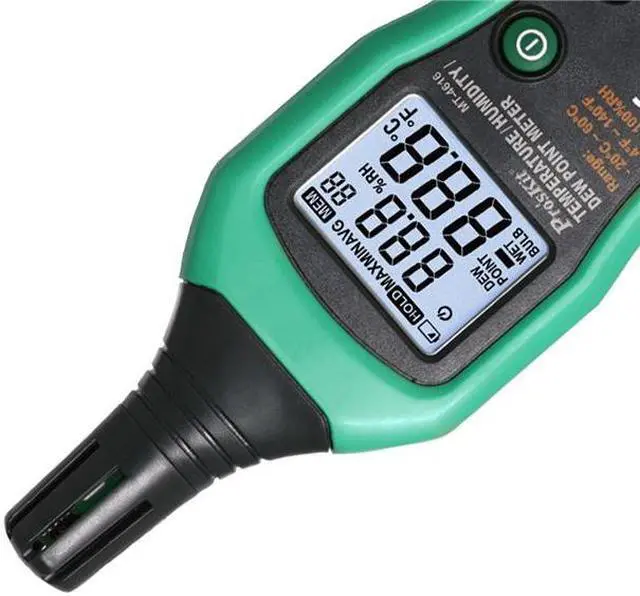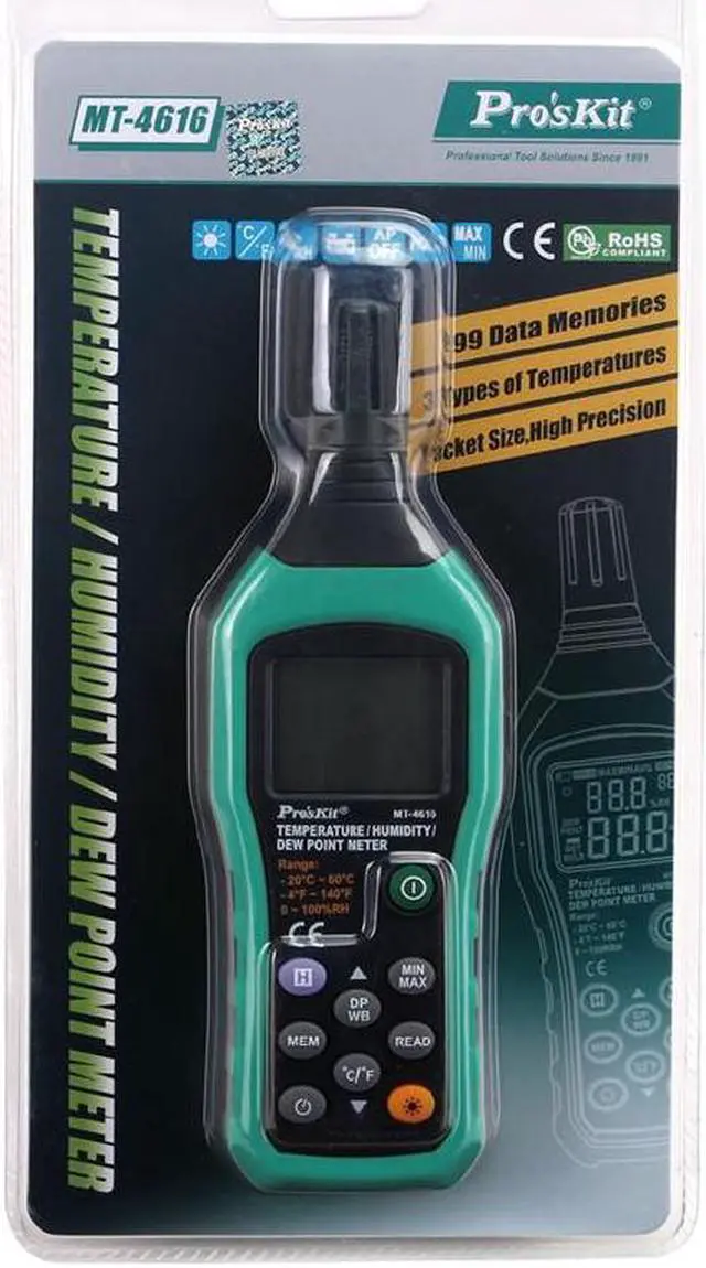 Temperature range:-20-60C(-4-140F)Humidity range:0-100RHDew point range:-50-60C(-58-140F)Power supply: AAA 1.5V *4(Do not contain batteries) Description:MT-4616 Temperature Humidity Dew Point TesterDew point measurement: Calculate the occurrence of icy goods; the possibility of exposure, avoiding the occurrence of harmHigh-speed microprocessor chip for higher stability and reliabilityWith data retention, backlighting, data storage, low voltage indicationUnit conversion, automatic shutdown, Max value Min value measurement functionApplicable to high temperature environment testApplicable to petrochemical, Electric power, metallurgy,electronics, chemical pollution detection