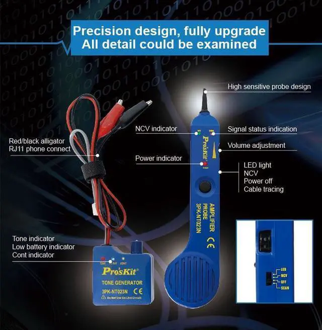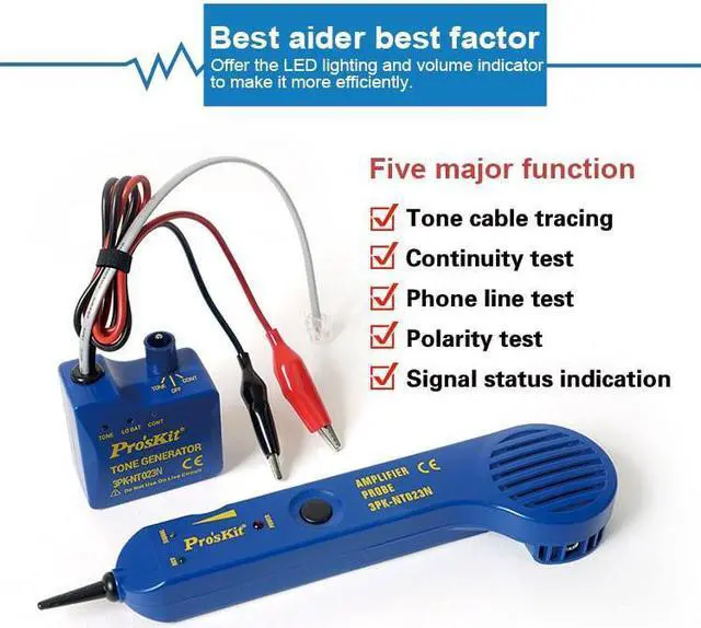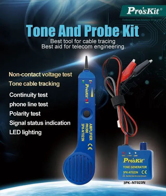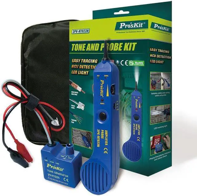 Amplifier probe Specification Frequency 1kHz Max. working current 70mA Function selection 4 Position mode switch (LEDNCVOFFSCAN) Earphone socket 1 Signal status indication LED & Buzzer NCV indication LED (AC 90~1000V) LED illumination Y Power indication LED x 1 Battery type DC9.0V (NEDA 1604/ 6F22 DC9V1pc, not include) Dimension(L x W x H) 230 x 56 x 25mm Weight 80g Accessory Storage bag x 1 Tone generator Specification Tone frequency 1kHz Max. testing distance 1.5km Max. working current 20mA Tone mode One / Two-note tone Compatible connectors De-energized AC wire, telephone/twisted pair wire, all voice Function selection TONE/OFF/CONT Continuity test 1 LED (10)Coaxial cable & solid/ stranded wire by alligator clips patch cord Max. signal voltage 8Vp-p LED indicator Power indicator x1, Phone line poliarity indicator x1, Phone line status indicatorx1 Live telecommunication equipment test and router test Y Voltage protection DC 48V Low battery indication 7V(Flashing power indication) Battery type DC9.0V (NEDA 1604/ 6F22 DC9V1pc, not include) Dimension(L x W x H) 65 x 58 x 34mm Weight 62g Features: Fast, accurate wire identification Rugged industrial design Sends tone to identify wires Three selectable tone outputs Two-line polarity indication Continuity test Adjustable volume control Visual signal strength indication Powerful speaker for noisy environments Recessed telephone test set connectors