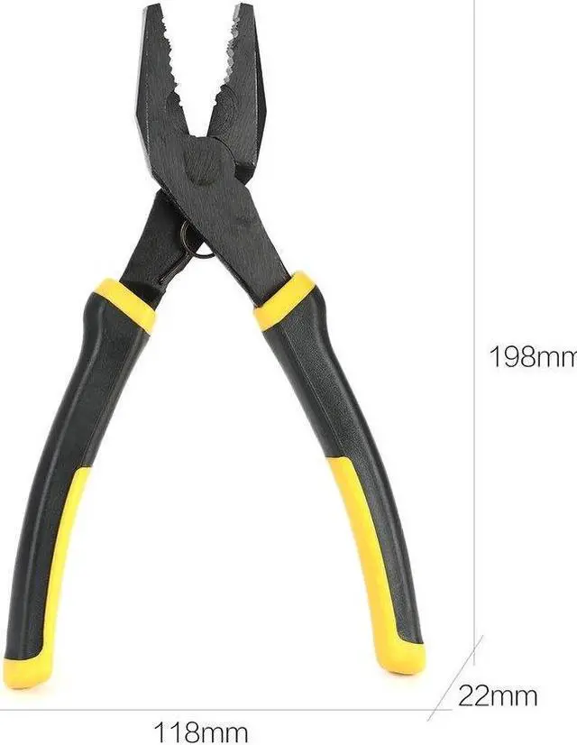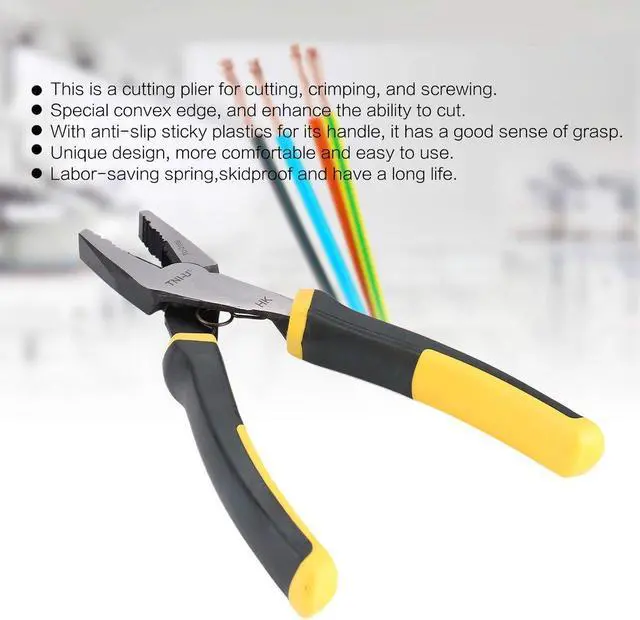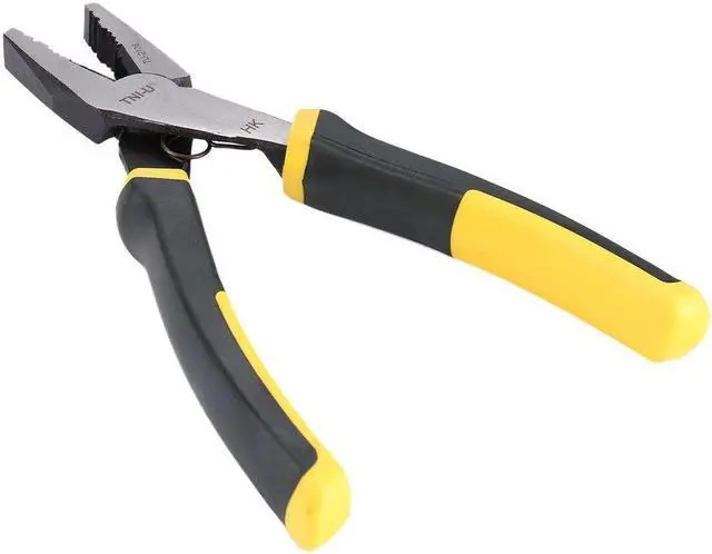 Specification:Brand:TNI-UModel:TU-2108Color: Black & YellowType:Flat Nose PlierHandle Style: StraightTip Size:39 x 22mm/1.54 x 0.87inItem Size: 198 x 118x 22mm/ 7.80 x 4.65 x 0.87inItem Weight: 303g/10.69ozPackage Information:Package Size: 261 x 85 x 26mm/ 10.28 x 3.35 x 1.02inPackage Weight: 333g/11.74ozBlister Package Feature:1.This is a cutting plier for cutting, crimping, and screwing.2.Special convex edge, and enhance the ability to cut.3.With anti-slip sticky plastics for its handle, it has a good sense of grasp.4.Unique design, more comfortable and easy to use.5.Labor-saving spring,skidproof and have a long life.Description:1.Plastic handle, labor-saving spring,skidproof and have a long life.2.High carbon steel tip treated by special hardness, high quality.3.Widely use in factory and home.
