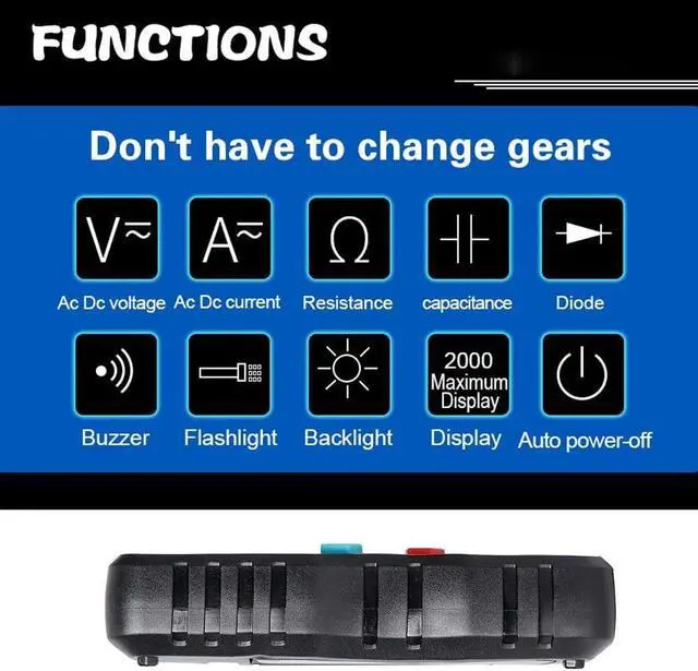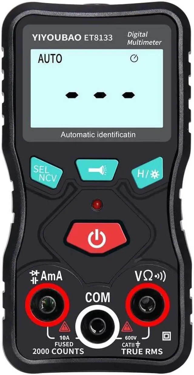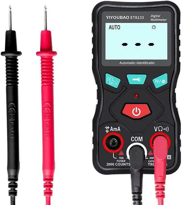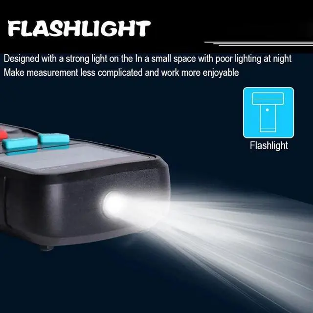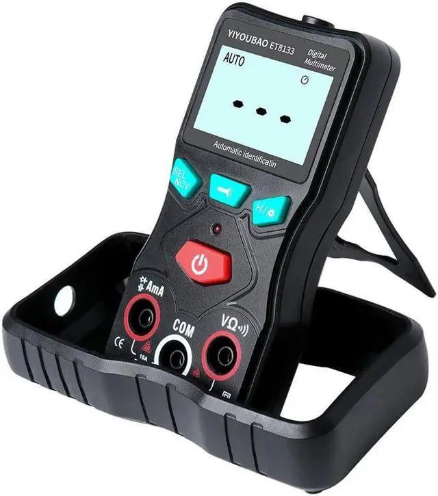 Specifications:Material: ABS+PVCColor: blackBattery: 2 * AAA 1.5V battery (not included)Display: LCD display, 2000 countsRange: automaticSampling rate: 3 times/secondDiode: YESCapacitance: YESTrue RMS: YESData hold: YESBacklight: YESFlashlight: YESAuto power off: YES (no measurement operation within 15 minutes)Low battery indication: YESEnvironment temperature: 0~40, humidity 75%Storage environment: -20~60, humidity 80%DC voltage:Range: 200mV/2.000V/20.00V/200.0V/600VResolution: 0.0001V/0.001V/0.01V/0.1V/1VAccuracy: (0.5%+3)Max.: 600VAC voltage:Range: 2.000V/20.00V/200.0V/600VResolution: 0.001V/0.01V/0.1V/1VAccuracy: (1.0%+3)Max.: 600VCapacitance:Range: 20.00nF/200.0nF/2.000F/200.0FResolution: 0.01nF/0.1nF/10nF/100nFAccuracy: 5%+3Max.: 200FAC current:Range: 20mA/200mA, 2A, 10AResolution: 0.1mA/0.001A/0.01AAccuracy:20mA/200mA/2A: (1.0%+3)10A: (1.5%+3)Max.:20mA/200mA: 200mA2A/10A: 10ADC current:Range: 20mA/200mA, 2A, 10AResolution: 0.1mA/0.001A/0.01AAccuracy:20mA/200mA: (2.0%+4)2A: (1.0%+5)10A: (2.0%+3)Max.:20mA/200mA: 200mA2A/10A: 10AResistance:Range: 2.000K/20.00K/200.0K/2.000M/20.00MResolution: 0.001K/0.01K/0.1K/0.001M/0.01MAccuracy:2.000K: (1.5%+3)20.00K: (0.5%+3200.0K: (0.5%+3)2.000M: (1.0%+3)20.00M: (1.5%+3)Max.: 20MContinuity: YESNCV: YESFrequency response in AC mode: 40Hz~1KHzLCD size: 45 * 25mm / 1.8 * 1.0inItem size: 124 * 65 * 26mm / 4.9 * 2.6 * 1.0inItem weight: 210g / 7.4ouncePackage size: 140 * 100 * 40mm / 5.5 * 3.9 * 1.6inPackage weight: 220g / 7.8ounce Now that we have entered the era of intelligence, multi-function digital multimeters have also been replaced by intelligent ones. This digital multimeter can not only meet the needs of daily life measurement, but also become a professional measurement teaching tool.Features:Fully intelligent automatic measurement digital multimeter, the digital multimeter in the measurement will automatically recognize and automatically display no need for human operation.The body is small and can be taken away in a pocket, which is more portable.Flashlight design lets you test efficiently and comfortably anywhere, indoors and outdoors, day and night.Designed with a backlight screen for night work and dark working conditions.The body is equipped with a shockproof and dustproof cover to refrain the instrument from being damaged due to falling down, giving the body a full range of protection.A bracket on the back for easy handling and placement.Functions: AC/DC voltage testing, AC/DC current testing, resistance and capacitance testing, diode, continuity, NCV, True RMS, data hold, backlight, flashlight, auto power off, low battery indication.
