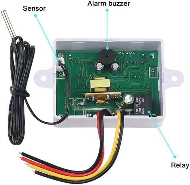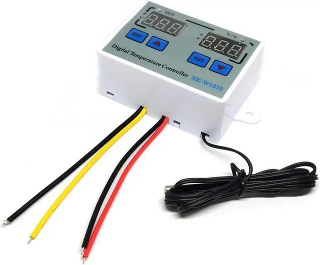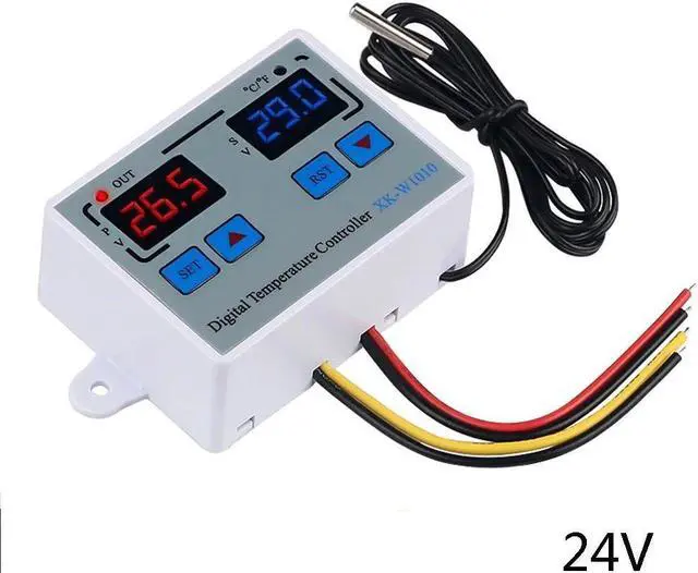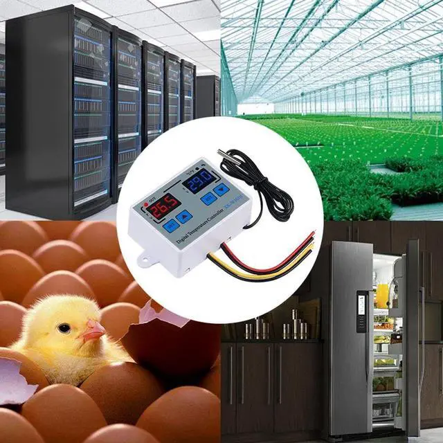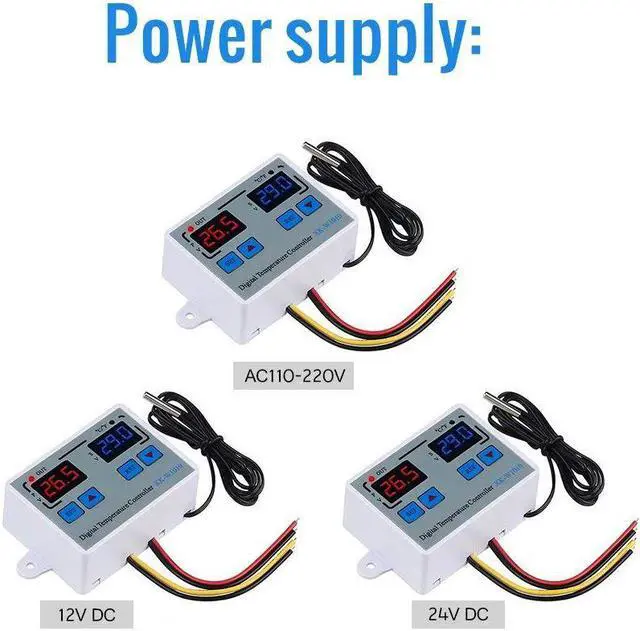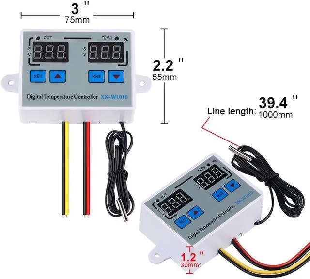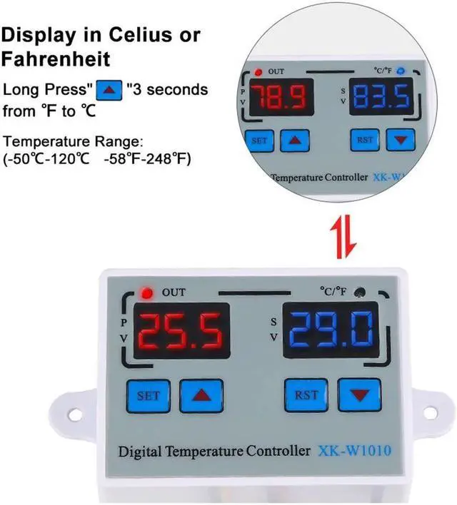 Instruction:Normal mode:The red digital tube on the left shows the real-time temperature, the blue digital tube on the right shows the set temperature.Setting mode: The red digital tube on the left displays the setting mode, the blue digital tube on the right displays the setting contents.How to set the start or stop temperature:Press the "SET"button onace and the screen flashed,Press the "up" and "Down" button to set the temperature.Set Mode:Code Function Set Range Default Start or Stop Temperature -55~120C/-67~248F 0C/68FP0 Working mode H H/CP1 Difference set value 0.2-30C 2CP2 High temperature alarm value -55~120C/-67~248F 120C/248FP3 Low temperature alarm value -55~120C/-67~248F -55C/-67FP4 Temperature calibration value -10.0C~10.0C 0P5 Compressor delay time 0-60Min 0P6 Display mode C/F CPackage List:1 * Temperature Controller1 * Waterproof Sensor Features:Heating or cooling control.Red and blue dual led display.Directly power output;Temperature display resolution 0.1.Multiple alarm mode selection.Switch between C and F.Support temperature correction and support for power loss (the parameters of the sudden power failure are still valid).Application range is like home temperature control, farm, various cold storage, greenhouse, aquarium, etc.Specifications:Display Type: DigitalMaterial: ABS+PCBTemperature sensor: NTC 10KSenor length: 1.0mTemperature measuring range: -55 C ~ 120 C / -66F~248FResolution: 0.1 CAccuracy: 1 CPower consumption: