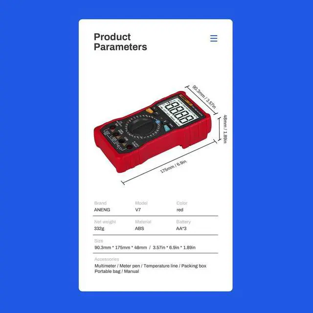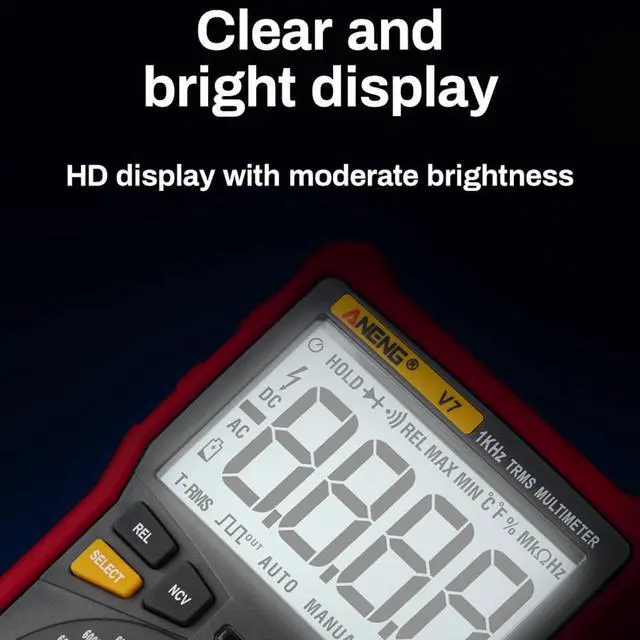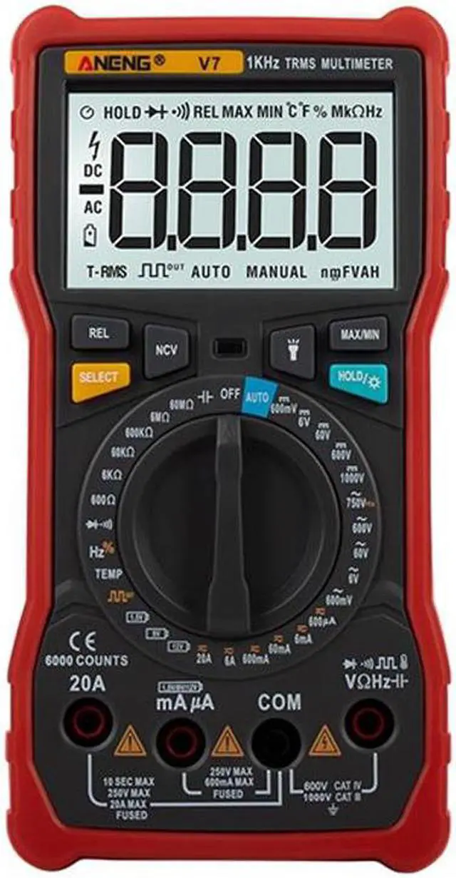 Specifications:Brand Name: ANENGModel: V7Color:black,red,blue,greenDisplay:6000 countsDC Voltage:600mV/6.000V/60.00V/600.0V/1000VAC Voltage:600mV/6.000V/60.00V/600.0V/750VDC Current:600uA/6.000mA/60.00mA/600.0mA/6.000A/20.00AAC Current:600uA/6.000mA/60.00mA/600.0mA/6.000A/20.00ATemperature:(-20~1000)/(-4~1832)Capacitance:9.999nF/99.99nF/999.9nF/9.999F/99.99F/999.9F/9.999mFResistance:600.0/6.000k/60.00k/600.0k/6.000M/60.00MFrequency:9.999Hz/99.99Hz/999.9Hz/9.999kHz/99.99kHz/999.9kHz/9.999MHzRanging:AutoMaterial:ABS/PVCUpdate Rate:3 times/secondTure RMS:Data Hold:Backlight/Flashlight:Low Battery Alert: Auto Power Off: Features:1.With 6000 counts display,wide measurement range.2.HD LCD display:The fonts are clear and the backlight screen allows for better viewing of data at night and in the dark.3.Temperature test:connection test line test the temperature by placing the thermocouple probe in the test object.4.NCV test:Non-contact voltage detection function make it detect voltage without touching any wires to avoid electric shock.5.Advantages:True RMS,auto range,auto power off,data hold,backlight,etc.Descriptions:1.This a digital multimeter,high reliability,high accuracy and portability,a perfect tool for the laboratory,factory and home.2.This digital multimeter can accurately measure AC/DC voltage,AC/DC current, resistance,capacitance,frequency,diode test,continuity test.3.Moreover,more advantages such as True RMS,auto range,auto power off,data hold,backlight,etc.
