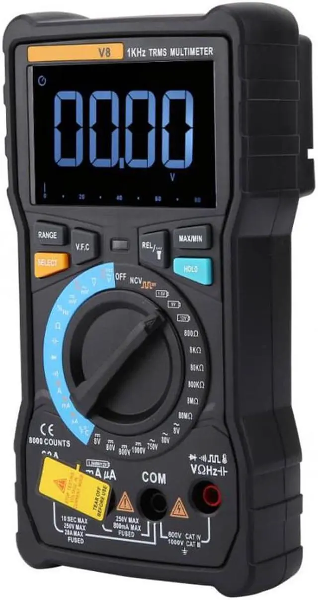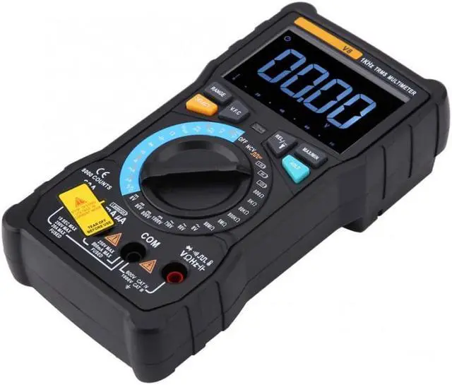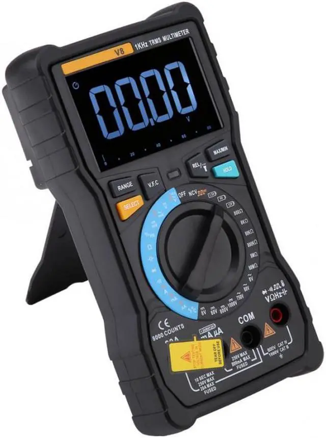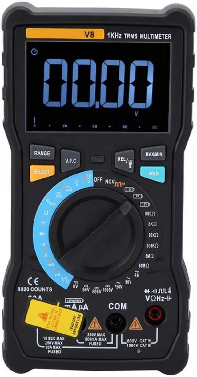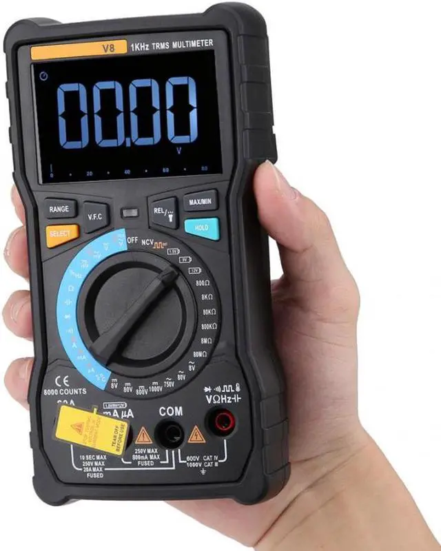 Frequency: 9.999Hz/99.99Hz/999.9Hz/9.999kHz/99.99kHz/999.9kHz/9.999MHz Duty cycle:1%~99% Square wave output:50Hz~5000Hz Battery test:1.5V/9V/12V Ranging:Auto/manual Material:ABS/PVC Update Rate:3 times/second Ture RMS: Data Hold: Backlight/Flashlight: Low Battery Alert: Auto Power Off: Features1.With 8000 counts LCD backlight display,wide measurement range and can read data in dark. 2.Temperature range:-20~1000(-4~1832). 3.NCV test:Non-contact voltage detection function make it detect voltage without touching any wires to avoid electric shock. 4.Advantages:True RMS,auto power off,data hold,max/min value,etc. 5.Multifunction:Can accurately measure AC/DC voltage,AC/DC current, resistance,temperature,capacitance,frequency,diode test,continuity,battery test. SpecificationsBrand Name: ANENG Model:V8 Display:8000 counts Temperature range:-20~1000(-4~1832) DC Voltage(V):8.000V/80.00V/800.0V/1000V DC Voltage(mV):800mV AC Voltage(V):8.000V/80.00V/750V AC Voltage (mV):800mV DC Current(A):8.000A/20.00A DC Current(mA):8.000mA/80.00mA/800.0mA DC Current(uA):800uA/8000uA AC Current(A):8.000A/20.00A AC Current (mA):8.000mA/80.00mA/800.0mA AC Current(uA):800uA/8000uA Resistance:800.0/8.000k/80.00k/800.0k/8.000M/80.00MCapacitance: 9.999nF/99.99nF/999.9nF/9.999F/99.99F/999.9F/9.999mF/99.99mF