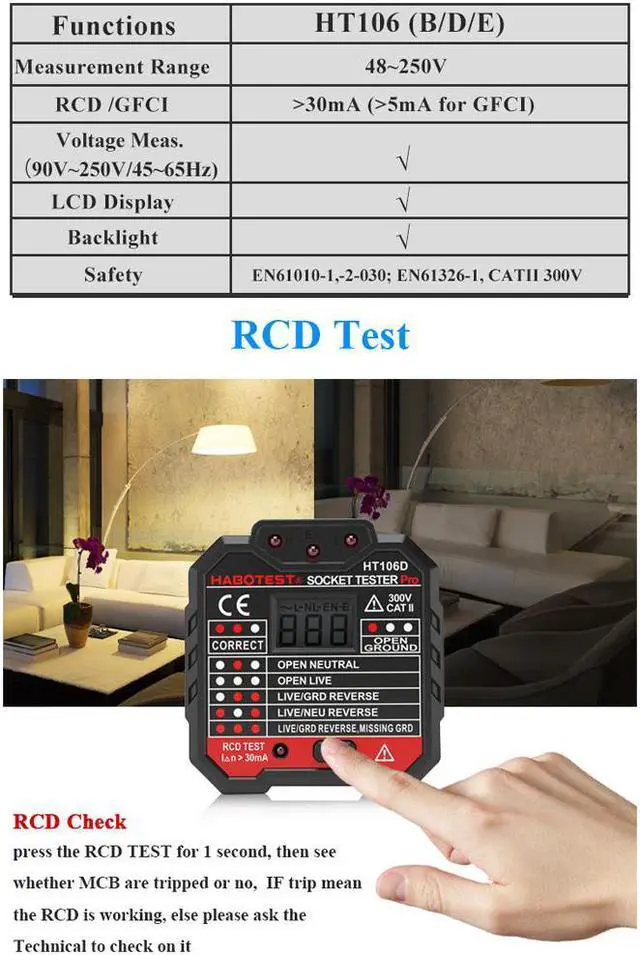 Package informations:Package weight:85g/3ozPackage size:73x73x73mm/2.87x2.87x2.87in Features:1. Mini portable design, easy to carry and simple to use.2. RCD (or GFCI) test.3. Voltage test(with LCD).4. Can detect the wiring status of the socket quickly and accurately.5. Widely used in the school, laboratory, factory and other social fields.Specifications: Brand:HABOTESTModel:HT106DPlug standard: EU plugOperate voltage: 48 - 250V/45 - 65HzMeasure voltage:48 - 250V/45 - 65HzAccuracy:(2.0%+2)Altitude:2000mRCD test:30mARCD working voltage:220V20VGFCI test:>5mAGFCI working voltage:110V20VItem weight:59gItem size:58x64x60mm
