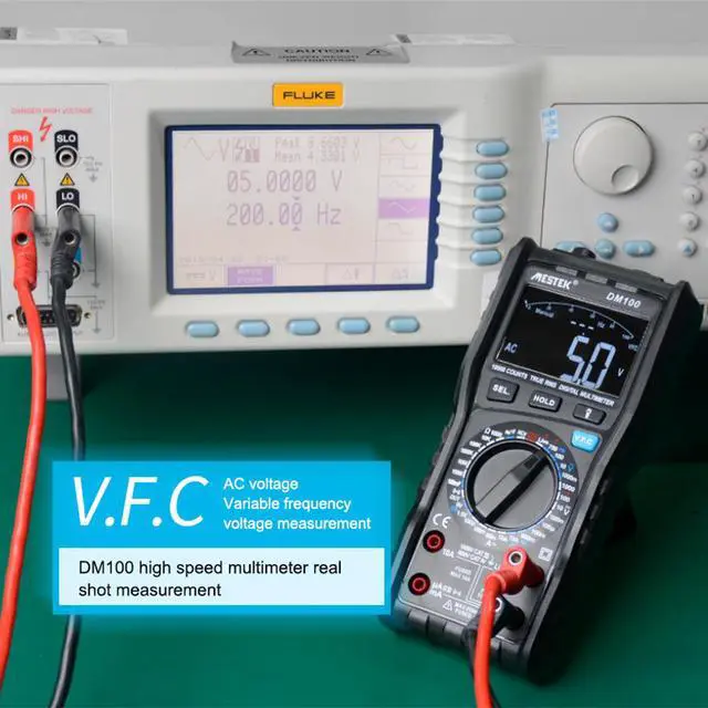 Features: 10000 counts, analog bars and digital dual display, intelligent dual core measurement data processing. High-speed measurement of voltage, resistance, capacitance. V. F. C variable frequency voltage measurement function, NCV non-contact measurement voltage, AC voltage and current frequency test, automatic identification diode & on/off. The fuse is disconnected from the automatic alarm function, multimeter pen wrong insert anti-burn alarm function. 1KHz real effective measurement, measuring 1.5V /9V battery voltage with load. Contact single-table pen recognizes live line, analog LCR professional capacitance test. Automatically detects ambient temperature and humidity values. The shell is made of ABS fireproof material and has a hard texture. PVC leather case, anti-fall and wear-resistant.