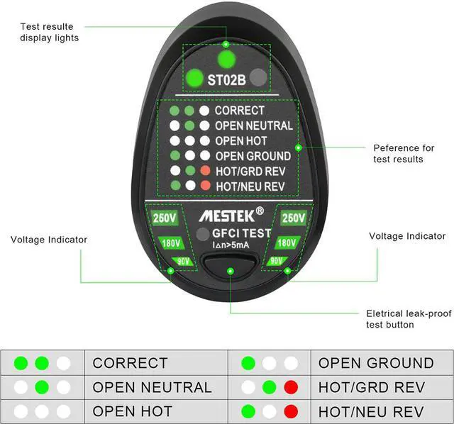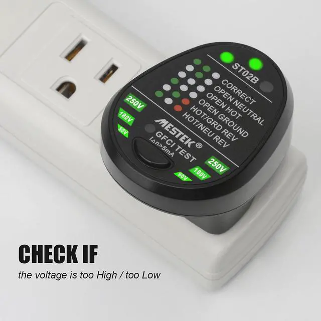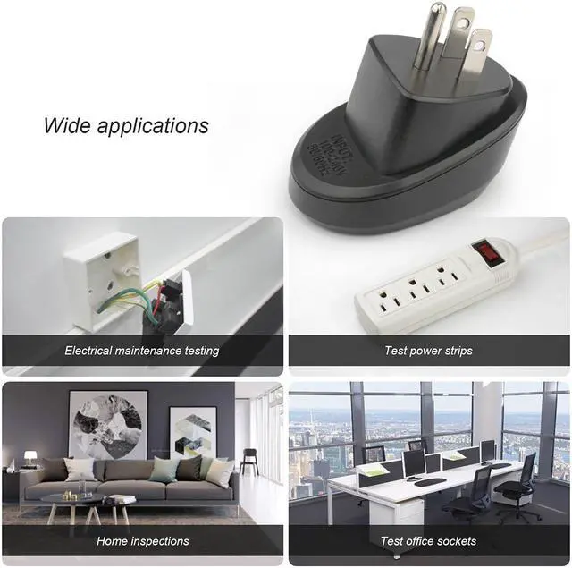 to judge: Correct, Open Ground, Open Neutral, Live/Neutral Reverse, Live/Ground Reverse, Open Live & Live Neutral Reverse. Bright LED Light & 3 Test Indicators - The light patterns are well labeled on the surface of the socket tester. The tester adopts a built-in light so it can also be used in the dark. Easy and fast to read the test result. Wide Application - Widely used for electric maintenance testing, office sockets testing, power strips testing and wall sockets testing in school, laboratory, factory and other social field. It saves you lots of time in testing problems with sockets. Portable Design - Compact size, light weight and convenient to use. With voltage backlight display for testing voltage.