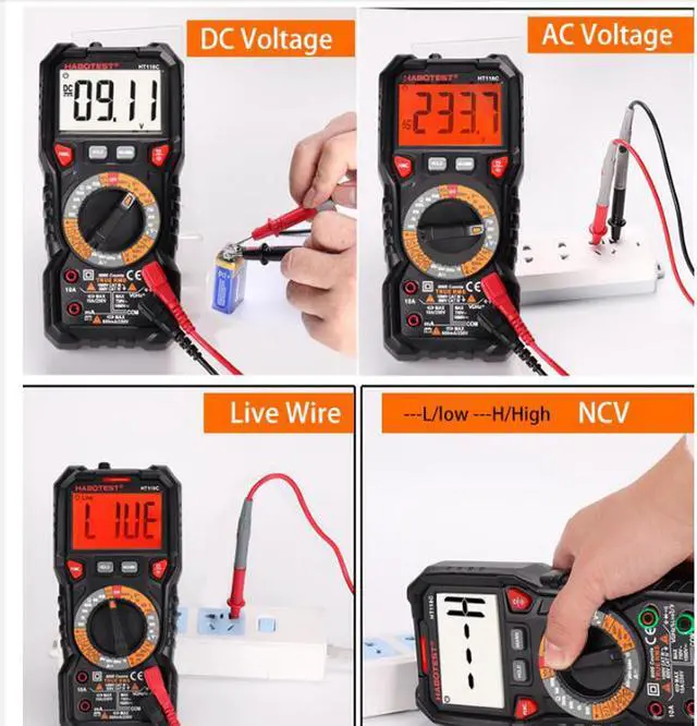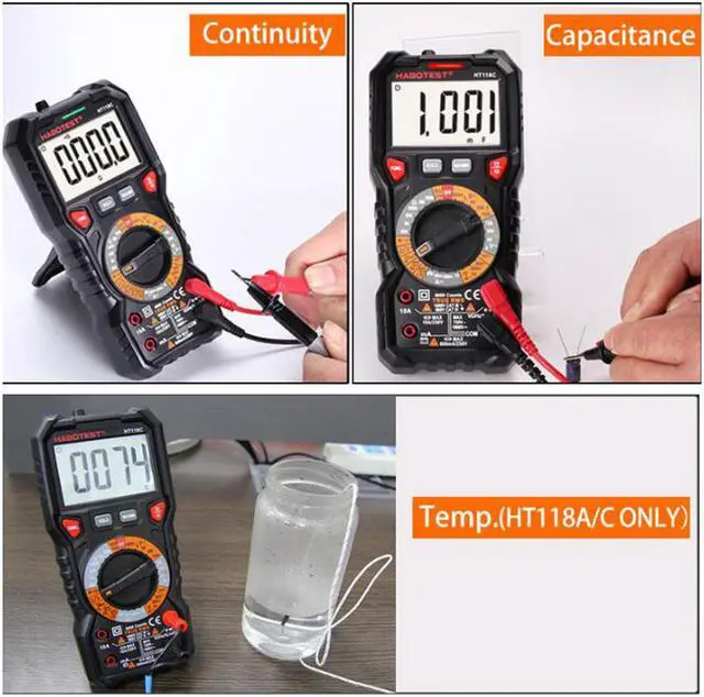 Measuring Range: for measuring DC/AC voltage, DC/AC current, Resistance, Capacitance, Diode test, NCV test, Live test, Battery test, Frequency, Temperature, etc.