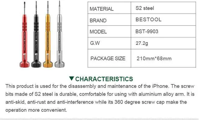 Phone Repair Tools Feature: Comfortable Handle 1 Aviation aluminum handle, good handle feeling, non-slip, anti-ompact, anti-rust, effectively improve work efficiency2 High-precision screw bit, fully matches with screw, and can drill broken screws easily. 3 S2 stainless steel
