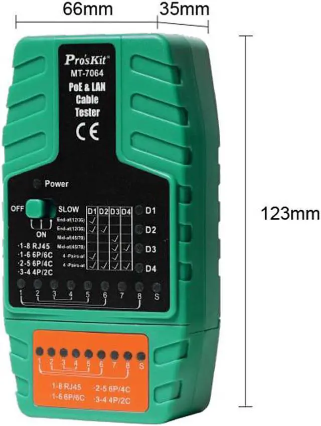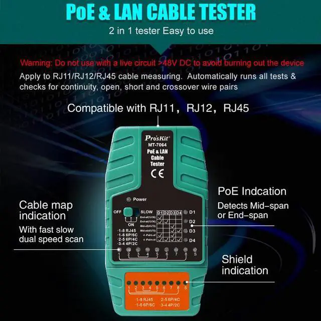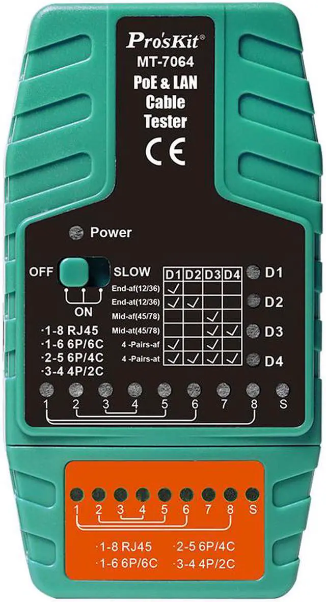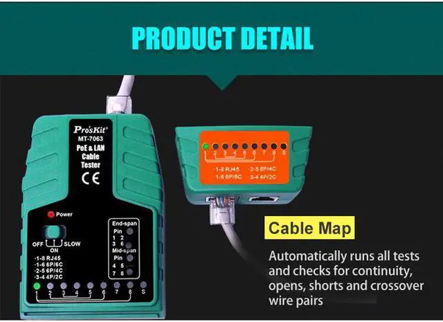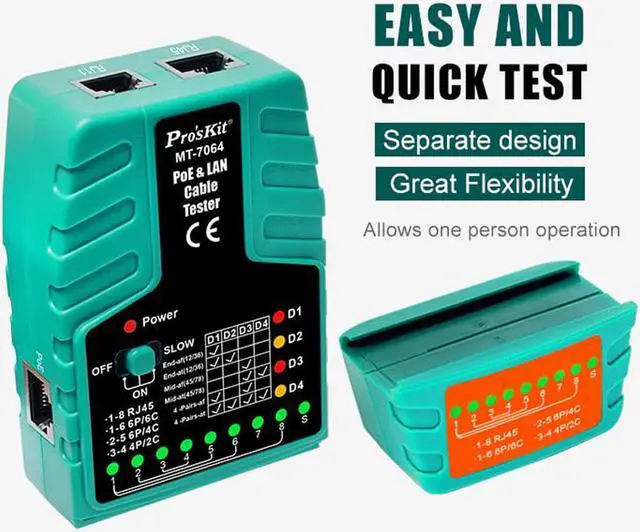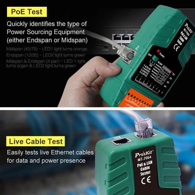 Specifications MT-7063-C MT-7064-C Max. distance of cable map 300m Compatible connectors RJ45 (8 pin) & RJ11(6P/6C/4C/2C) & RJ12 & PoE Cable types tested RJ45 Lan cable Cat 55e6(UTP/STP) RJ11/12 Telephone Cable Cat 3 (6P/2C/4C/6C) Cable map indication 8 LEDFast/Slow dual speed Shielded indication Yes PoE indication (Master) Midspan/Endspan 802.3 af/at PoE standard and Midspan/Endspan Live telecommunication equipment test and router test Yes Dimension (LWD) Master1036627 mm, Remote1033527 mm Battery type DC 9.0V Weight 130gNot including battery) Easily tests Ethernet network for power over Ethernet existence Quickly detects the type of the Power Sourcing Equipment (either Endspan or Midspan MT-7064 is an advanced type which can easily identify IEEE 802.3 af/at PoE standard and Midspan/EndspanCable Tester Check the RJ11/RJ12/RJ45 pin to pin cable map Automatically runs all tests and checks for continuity, open, short and crossover wire pairs Cable mapping up to 300M