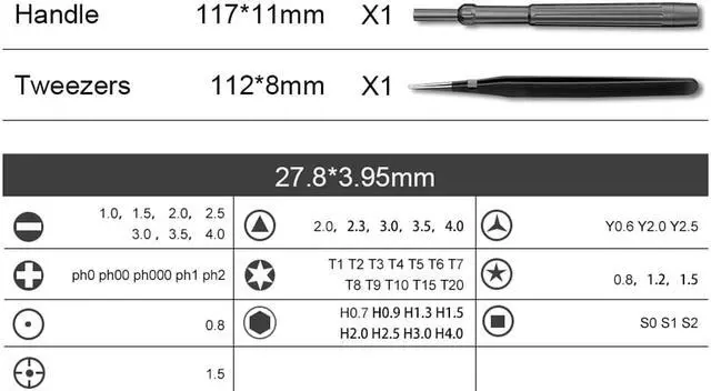 8934A: Handle 117*11mm X1 Sim Eject 33*7mm X1 Tweezers 112*8mm X1 Crowbar 72*8mm X1 Pry Pick 30*30mm X4 Screwdriver Bits *16