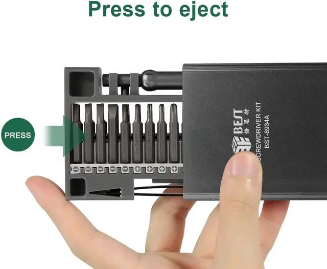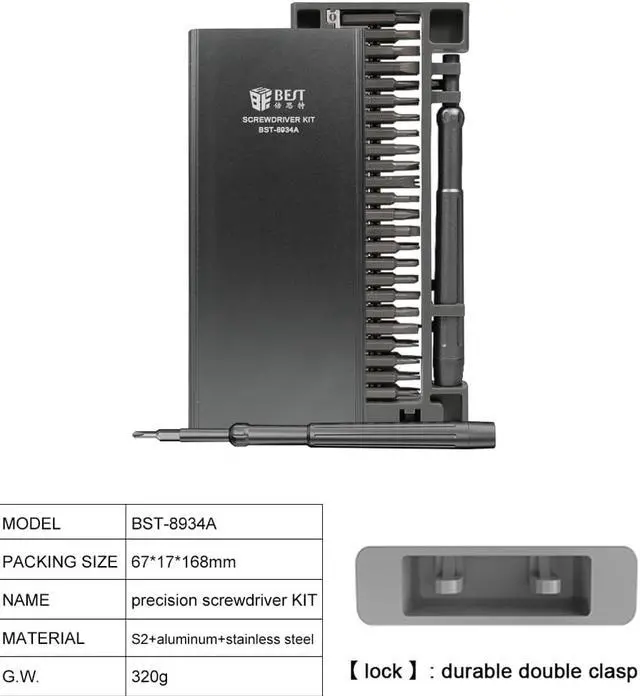 Lock: durable double clasp Press to eject Can repair all kinds of electronic products Strong magnetic groove Swivel capMore convenient disassembly Tight adsorption