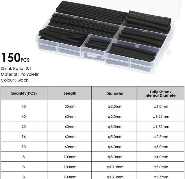 Features: This polyolefin material kit contains 150pcs shrink tubing in black color. Big collection of heat shrink tubing 8 specifications with different sizes. Perfect for protecting the point of connection from any kind of elements. 2:1 shrink ratio. High expansion ratio makes it possible to repair most damaged cable jackets. Wide application for electrical insulation, wire bundling, colour coding, mechanical protection, wire/cable joints and repairs etc. The durable compact translucent storage box prevent against water, moisture and disorder.