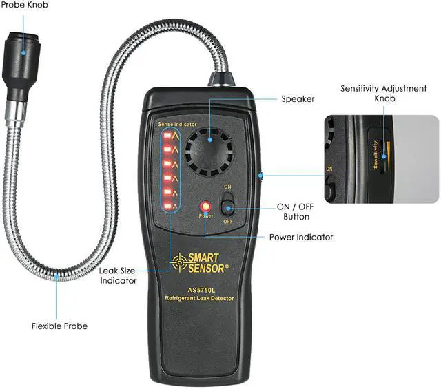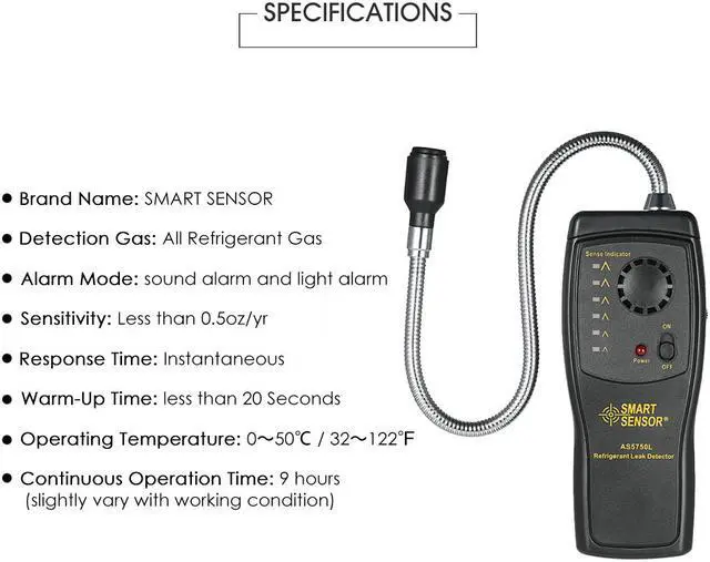 Features: Hand-held design for easy operation. Can detect all kinds of halogen refrigerant gas. Equipped with long flexible stainless probe for all application. LED display to show the relative leak size. With adjustable sensitivity and fast warm-up. Audio & visible leakage alarm indication and low battery indication. Compact size and light weight, easy to carry.