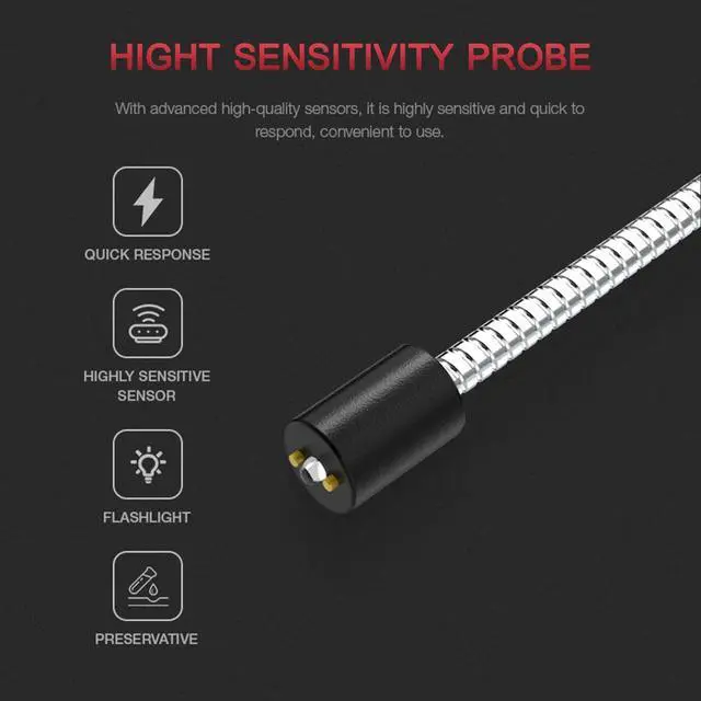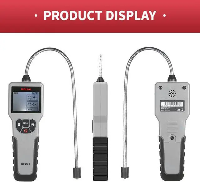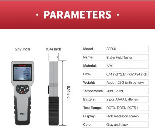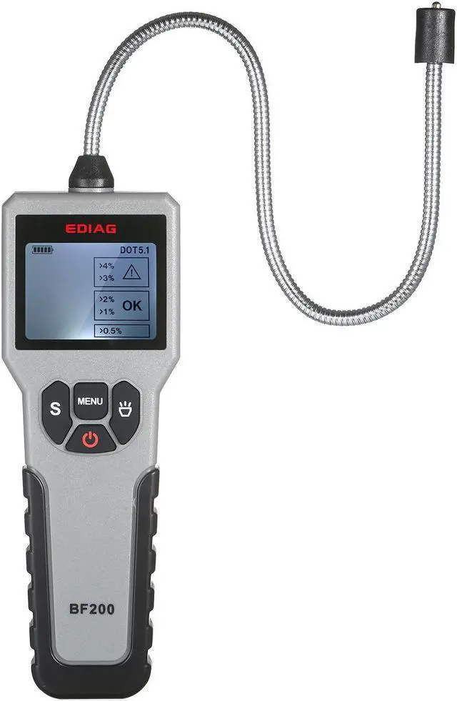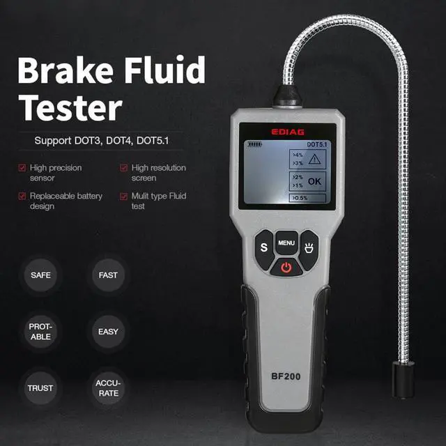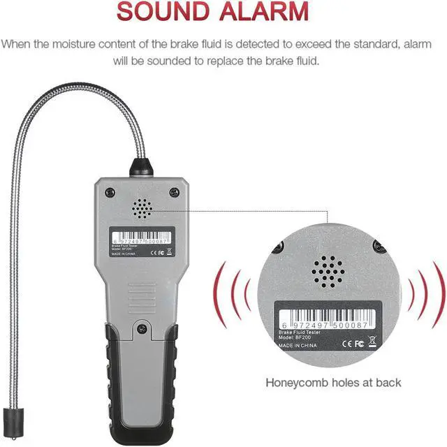 Black Features: Scope of Application --- Automotive Brake Fluid Detector is common fit for most vehicle. Check the health status of DOT-3, DOT-4, DOT- 5.1 brake fluid and also most synthetic brake fluids. It's extremly convenient for personal use and broadly applied in individual workshops, repair factories and dealer workshops. Precision Testing & Universal Probe --- High sensitivity and precision probe, can be fast and accurate detect DOT-3, DOT-4, DOT- 5.1 brake fluid and got result in seconds. The Goose Neck Probe provides flexibility on detection, which helps the detect process more elastic and efficiency. Easy Instant Reading & Alarm --- High Sensitivity Probe + High Resolution Screen + Sound Alarm, instand shows result, large display with backlight, easy and clear read under sun or night. Never limited by the enviroment. Once brake fluid including too much water alarm will be sound to remind you replace the brake fluid. Premium Quality & Ergonomic Design --- Fuselage with good texture, compact size, perfect hand-feeling. Goose neck surface oils and oxidation resistant, not easily corroded. Simple operation panel, easy to use.