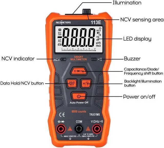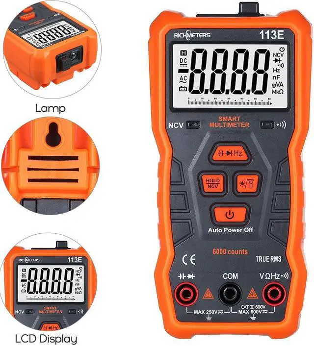 RICHMETERS RM113E NCV Digital Multimeter 6000 Counts Auto Ranging AC/DC Voltage Temperature Measuring Meter Flash Light Backlight Large Screen