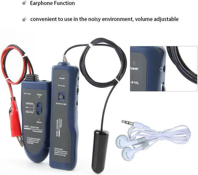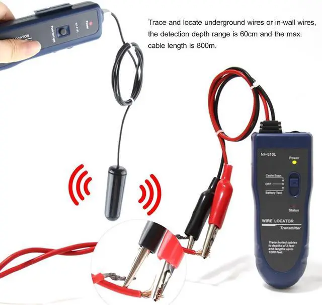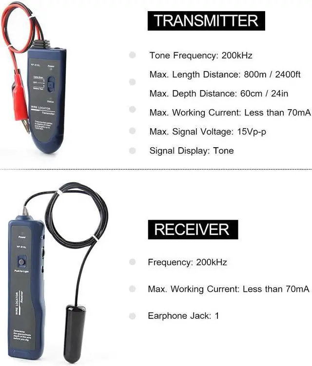 Power Supply: the transmitter and receiver are both powered by the 3.7V rechargeable lithium battery, both with low battery indicator. Trace and locate underground wires or in-wall wires, the detection depth range is 60cm and the max. cable length is 800m.