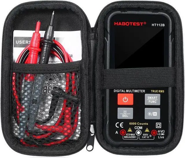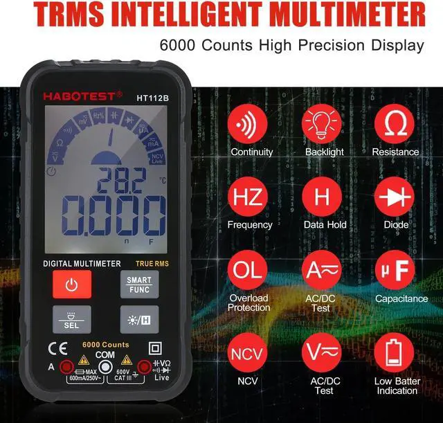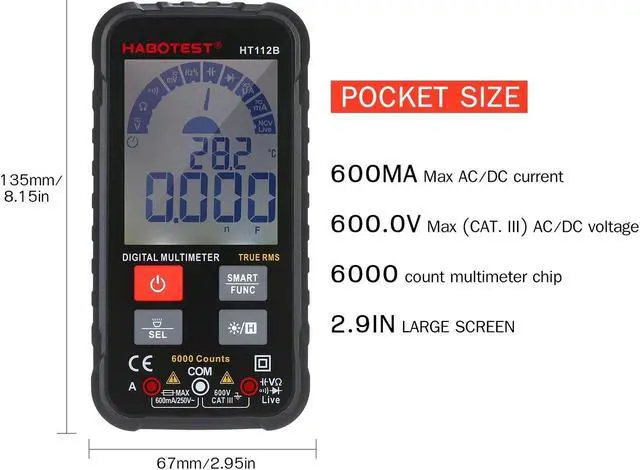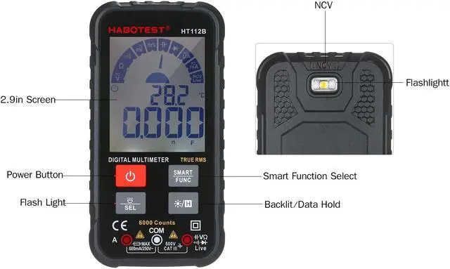 Features: WIDE RANGE OF TEST --- This Digital Multimeter can used to measure AC/DC Voltage, AC/DC Current, Resistance, Continuity, Capacitance, Tests Diodes Transistors, NCV Live Line. SMART MEASUREMENT --- It can automatically match DC current, AC voltage, resistance, continiuty without changing functions. When measuring AC voltage, the frequency displayed at the same time. When measuring resistance, when the resistance is less than 50, the buzzer will sound and the indicator will light up. HIGH PRECISION DISLPAY --- This multimeter part uses a dedicated, 6000-count chip, which can provide a higher precision. 2.9 in Large LCD display with backlit for clear view even under darkness. PRACTICAL --- True RMS, NCV, Continuity Buzzer, Backlight/Flashlight available, AC/DC current 600mA Max, AC/DC
