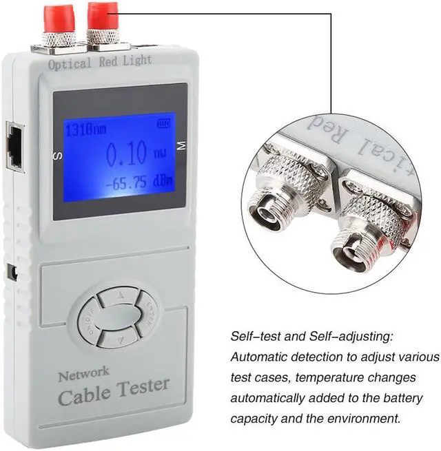 Cable Test ParametersTestable Material5E, 6E twisted pair, telephone wire and other metal wirePortRJ4, RJ11Measurable Length1-1200 metersScanning LengthMore than 3000 meterOptical Power Meter ParameterStandard Wavelength850mn, 980nm, 1300mn, 1310nm, 1490mn, 1550nmMeasurable Wavelength800nm-1600nmMeasurable Range-70dBm-+10dBmResolution RatioLinear 0.1 %, logarithm 0.01 dBmMeasuring Sensitivity 0.01 nwProbe TypeInGaAsRed Light Resource650run 5mW visible laser light sourceLength