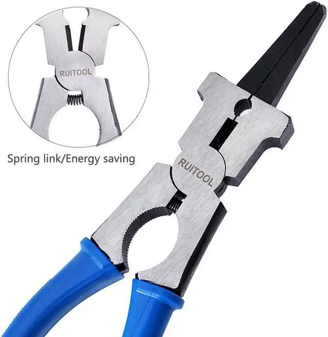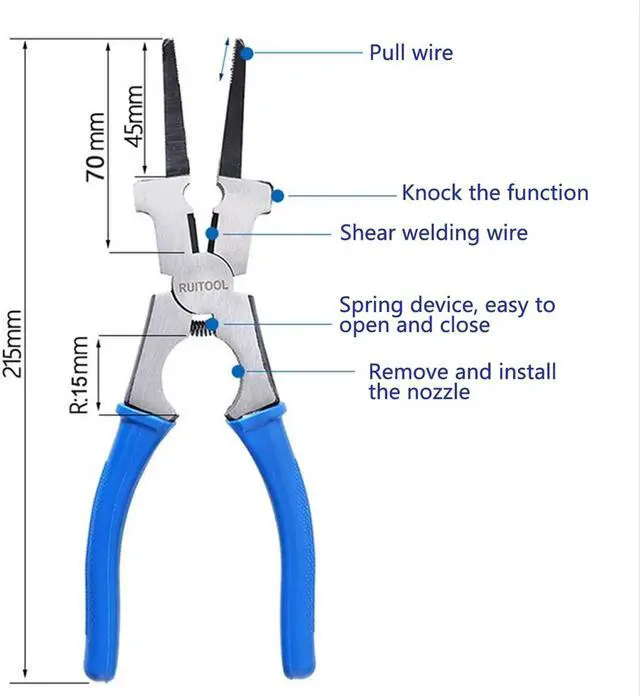 Features: Superior metal material, high hardness, wear-resistnt, anti-rust. Pull wire head, 15mm length denticulate hinge. High hardness material, has hammering function. Easy to shear welding wire. Spring link, easy to open and close. The nozzle can be removed and installed easily. Skid resistant hand shank, comfortable to handle.