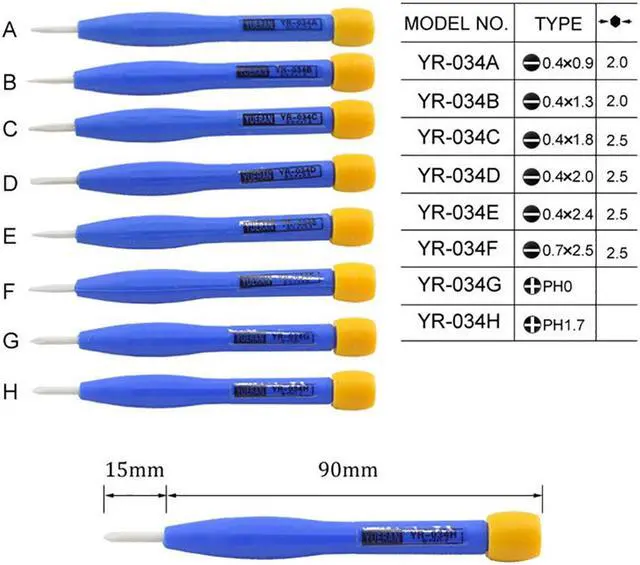 (Unit: mm)YR-034A ( 0.4 x 0.9 ) Bit Dia. 2.0YR -034B ( 0.4 x 1.3 ) Bit Dia. 2.0YR -034C ( 0.4 x 1.8 ) Bit Dia. 2.5YR -034D ( 0.4 x 2.0 ) Bit Dia. 2.5YR -034E ( 0.4 x 2.4 ) Bit Dia. 2.5YR -034F ( 0.7 x 2.5 ) Bit Dia. 2.5YR -034G (+PH0)YR-034H (+PH 1.7 )