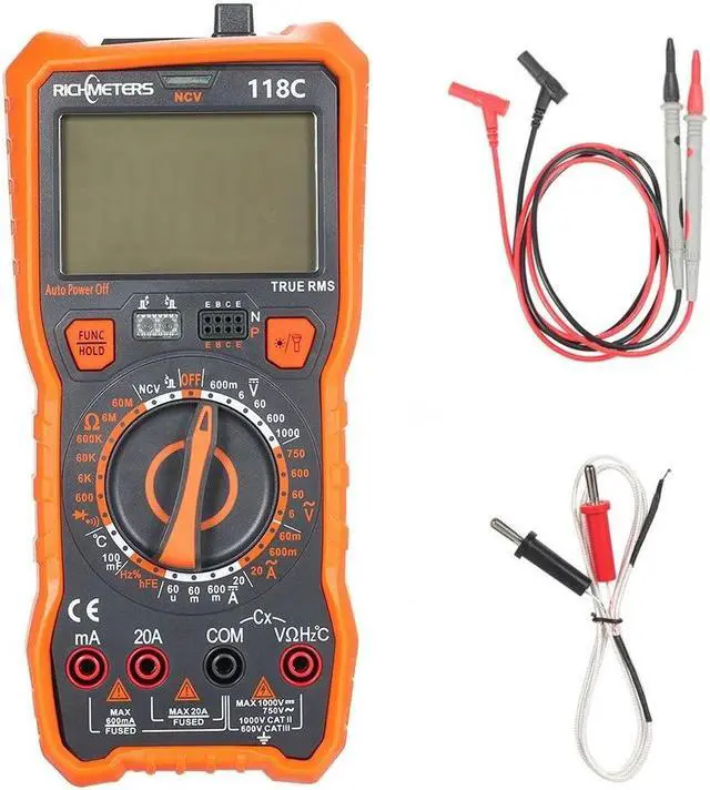 Features: The back has support, effective auxiliary measurement, improve efficiency. There is a slot in the back for you to put the test leads when not in use. Large LCD display with white backlight, easy to read. Wide measuring range, low battery indication, it is more practical. Multi-functional, can measure AC / DC voltage, AC / DC current, resistance, capacitance, frequency, NCV, diode, temperature, continuity.