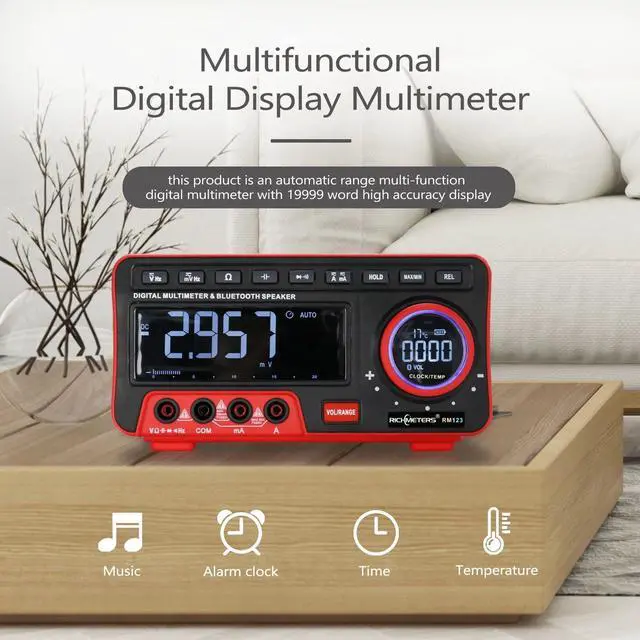Features: This product is an automatic range multi-function digital multimeter with 19999 word high accuracy display. The meter is driven by two lithium batteries (included or not included, optional), with true RMS measurement, LCD display, adjustable backlight brightness, clear reading, clock, alarm clock, BT audio, ambient temperature display. During measurement, it can connect BT to play music, which can add fun to your work. 360 surround sound quality, double speakers, bass shock to feel different effects. Not only multimeters or speakers, but also alarm clocks. Multifunctional home helper, practical and powerful. Wide range of use, strong compatibility, suitable for power substations, voltage detection, electronic circuit maintenance, vehicle maintenance and repairing, home circuit detection, electronic equipment testing.