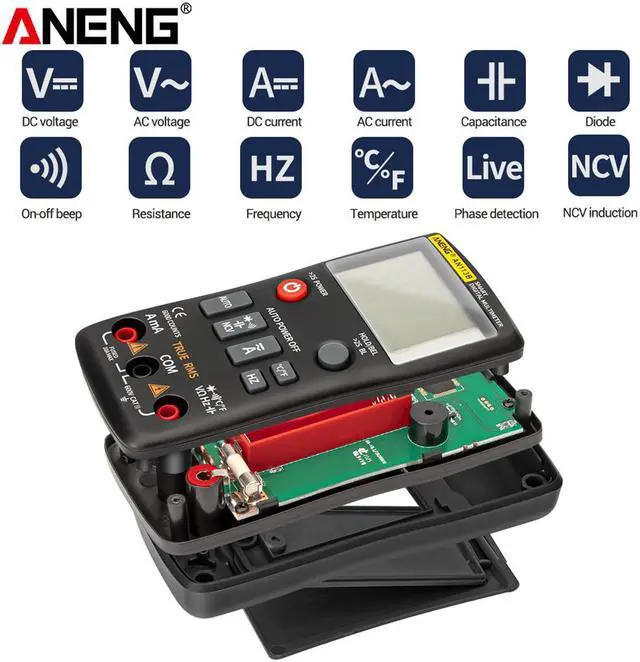 Features: This product is a multi-functional, auto-ranging, true RMS digital multimeter with a 6000 counts LCD display. Measurement functions include AC/DC voltage, AC/DC current, resistance, diode test/continuity, NCV, frequency/duty cycle, capacitance test. Support temperature measurement. Support Auto Power Off. Support True- RMS.