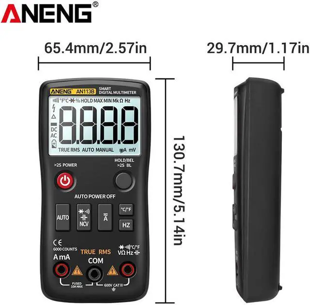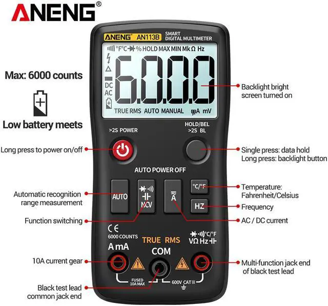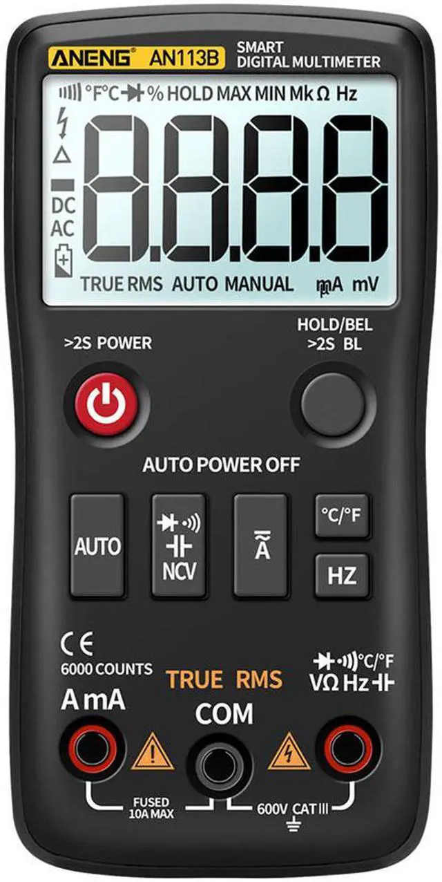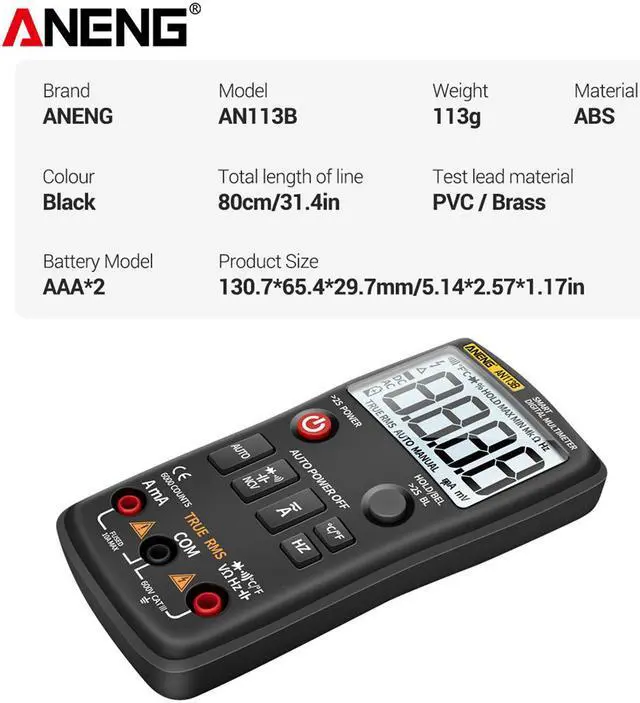 BrandANENGModelAN113BDisplay6000 countsRangeAutoMaterialABS Update Rate3 time/SecondTrue RMSyesRELyesData Hold yesBacklightyesAuto Power OffyesLow