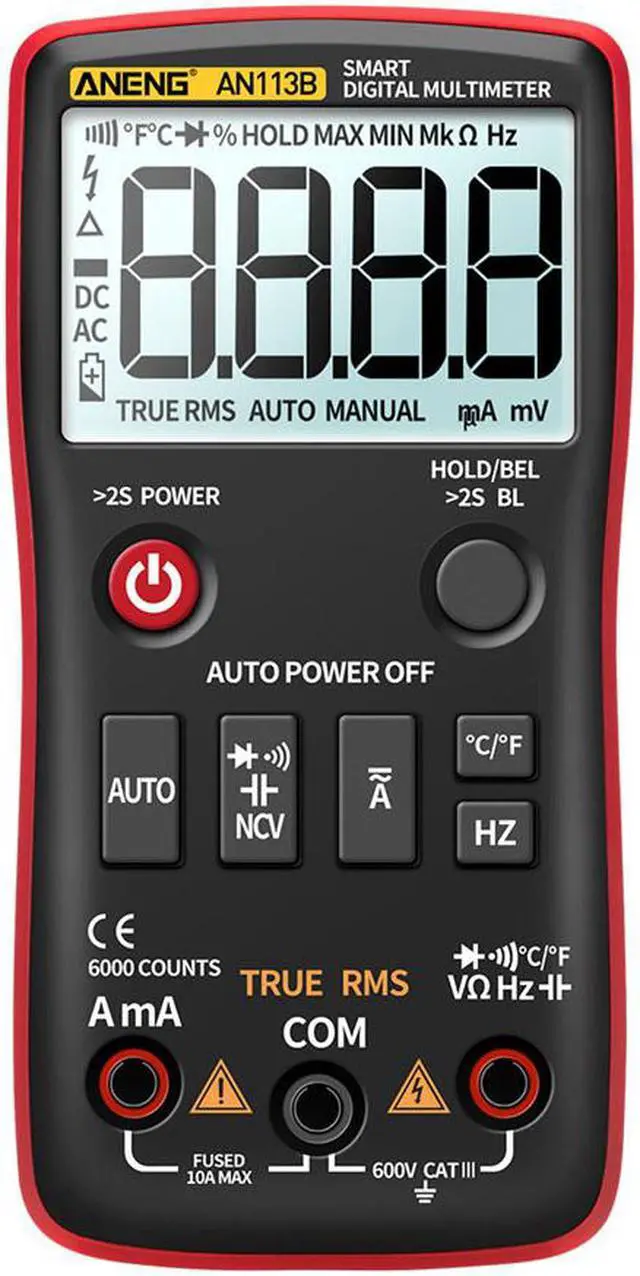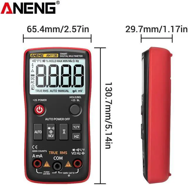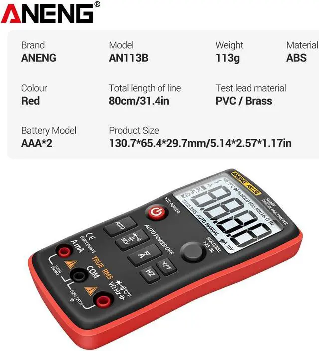 BrandANENGModelAN113BDisplay6000 countsRangeAutoMaterialABS Update Rate3 time/SecondTrue RMSyesRELyesData Hold yesBacklightyesAuto Power OffyesLow