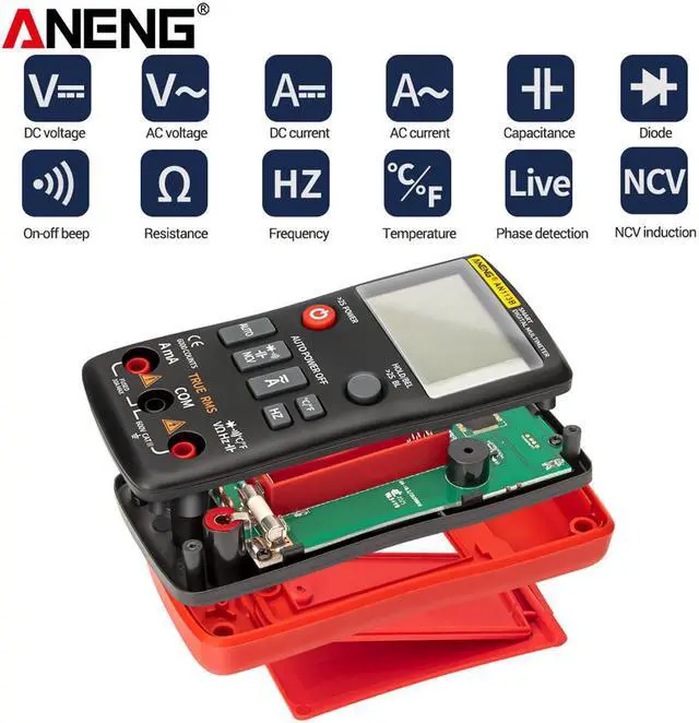 Features: This product is a multi-functional, auto-ranging, true RMS digital multimeter with a 6000 counts LCD display. Measurement functions include AC/DC voltage, AC/DC current, resistance, diode test/continuity, NCV, frequency/duty cycle, capacitance test. Support temperature measurement. Support Auto Power Off. Support True- RMS.