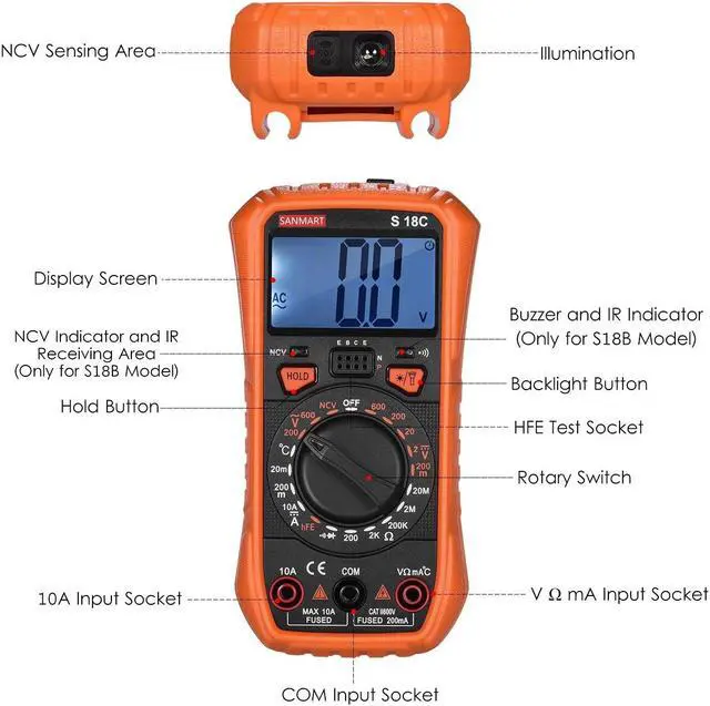 Measure Gauge: this meter can be used to measure AC/DC voltage, DC current, resistance, diode and buzzer, temperature (only for model S18C), infrared signal detection (only for model S18B).