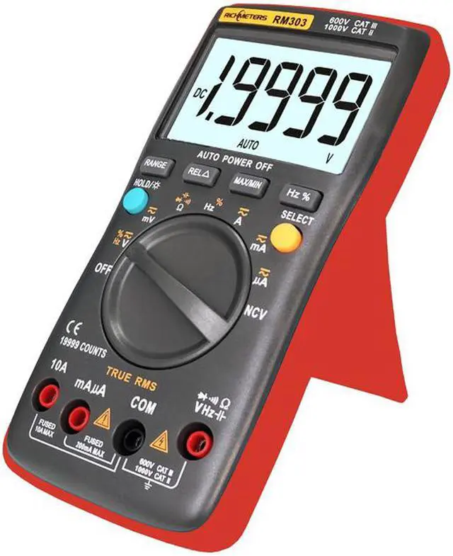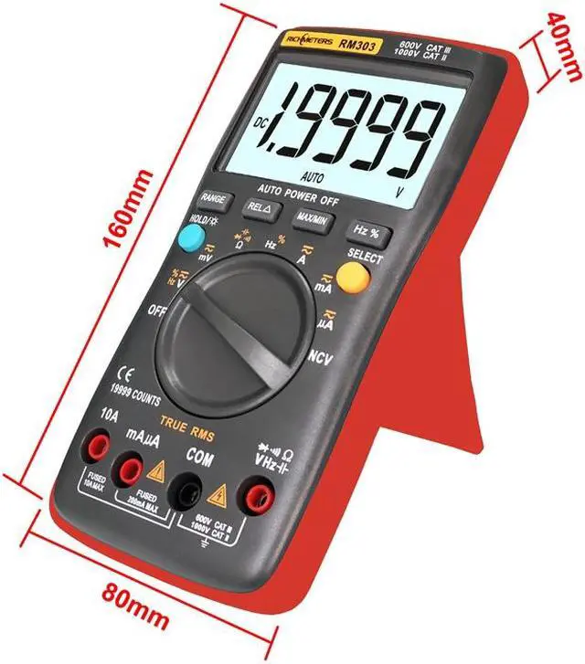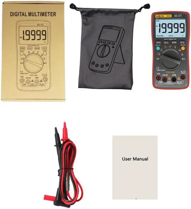 function: AC/DC current, AC/DC voltage, resistance, frequency. Large LCD display, maximum display 19999 counts. Auto turn off if there is no measurement within 15mins, energy-saving and safer. Data hold and backlit LCD with large digits for visibility in dimly lit areas. High precision, mini size, portable, and easy to carry. Protective rubber guards with anti-break bracket designWidely used in laboratory, factory and family for circuit or instrument maintenance and repair.