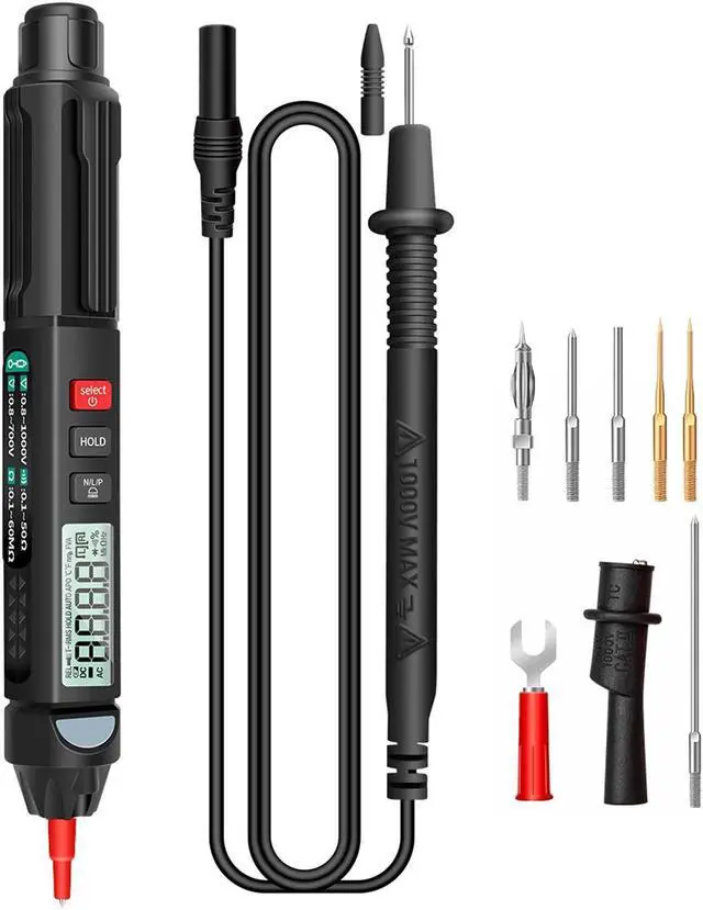 • Features:VERSATILE PEN MULTIMETER: This multimeter features test of resistance/capacitance/diode/frequency/temperature, continuity, zero line & non-contact voltage detection, etc.FAST RESPONSE & HIGH ACCURACY: ANENG A3007, 6000 counts digital pen type multimeter, has a sampling speed of 3 times per second and high precision measurement.EASY OPERATION: It has LCD clear screen, easy to read the measured values, flashlight available for darkness, data retention function convenient to query data, alarm beep when in use.DURABLE MATERIAL & PORTABLE SIZE: The meter, made from selected electronic components and sturdy plastic housing, is designed with light weight and easy-to-carry pocket size, comfort to grip.WIDE APPLICATION: The digital multimeter--a handy instrument and assistant, for testing, diagnosing and solving a variety of automotive and daily household electrical problems safely and accurately. MULTIPLE ACCESSORIES: 1