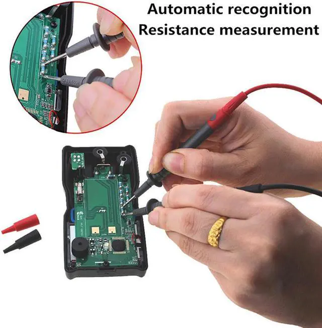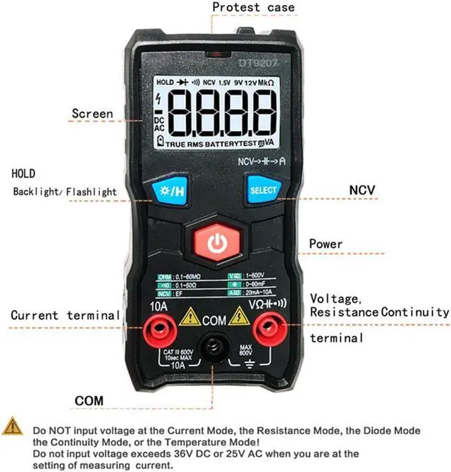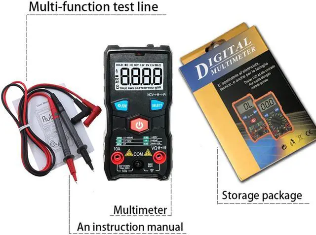 materialsize: 120 x 60 x 30mm Full Smart Digital Multimeter, Automatic identification of measurement dataHigh-brightness lighting flashlight Users in the night and low-light environment can be used normallyDC voltage measurement, 6F22 9V battery, Automatic recognition, Resistance measurementElectric pen function (NCV) measurement Press and hold the NCV button and place it near the object to be measured to measure whether the object is live (only AC can be measured)