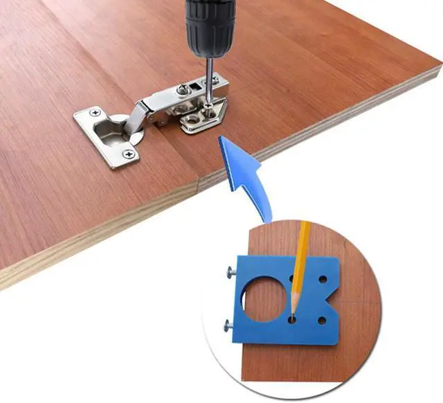 hole locatorFunction: light and portable, easy to operate; sharp and durable, continuous knife, Suitable for positioning and installation of furniture door hingesInstructions: 1. Determine the position of the hinge cup, the short plate is facing upward, the screw is fastened on the edge of the wooden board, and the hinge cup hole is drilled; 2. Draw a corresponding center line on the other board, the short board faces downward, the middle line is aligned with the inverted e, and the hinge positioning hole is drilled; 3. Install the hinges.