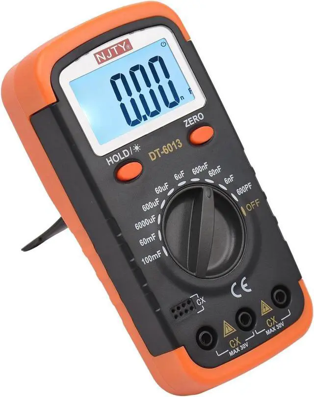 Features: This digital capacitance meter is built in with high accuracy chip and high speed processor, features 6000 counts and 10 measuring ranges from 600pF to 100mF. Made of selected ABS material, the housing is wear resistant and with great durability. Compact size, easy to hold and operate. Large LCD screen with backlight display, data hold function and zero function, making it easy and clear to read even in dark environments. The kit also contains 2 crocodile clips and 2 fuses ( 0.2A ). Powered by 2 AA batteries (not included), easy to install or replace batteries. Foldable bracket makes it take up less space and easy to be placed on the desktop; and also makes it convenient to carry outside.