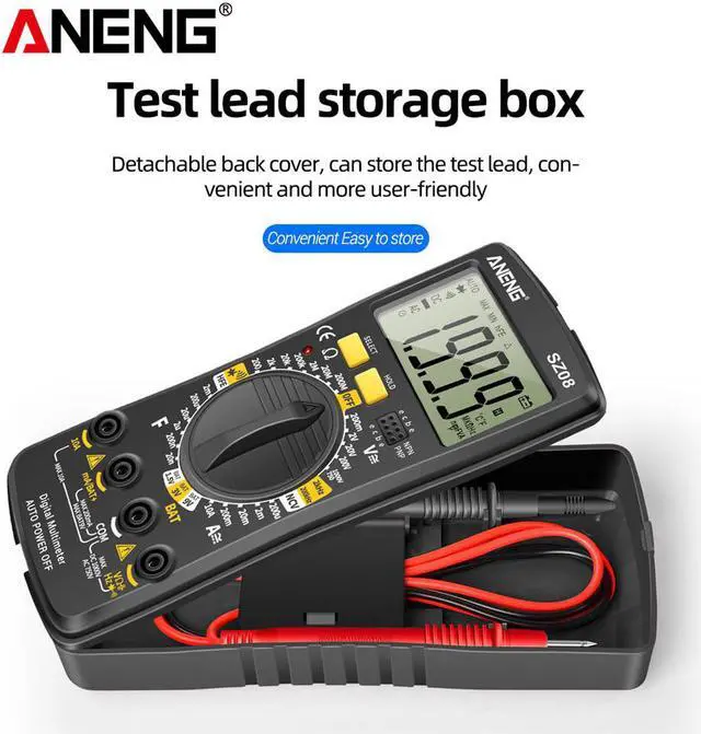 Description: Digital Multimeter LCD Professional Multimetro Auto Voltmeter Resistance Handhold Testers with Test LeadDigital multimeter tester is a multi-functional, auto-ranging digital multimeter with a 9999 counts LCD. When measuring, can tilt on the table, effectively support the digital multimeter tester, convenient standing operation measurement, check the value at any time. Lightweight, durable, no load-bearing. High-precision multimeter, multi-function measurement, removable back cover placement test lead.