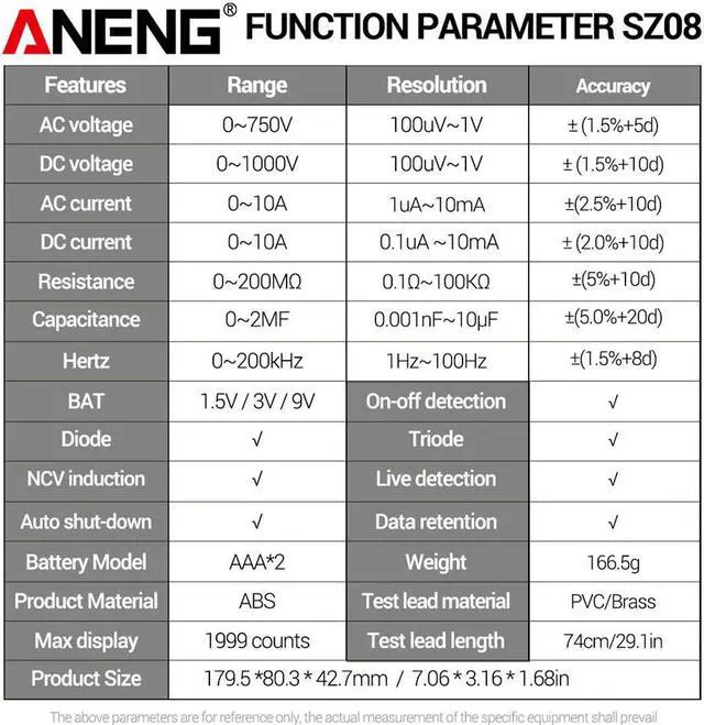 • Description:Digital Multimeter LCD Professional Multimetro Auto Voltmeter Resistance Handhold Testers with Test LeadDigital multimeter tester is a multi-functional, auto-ranging digital multimeter with a 9999 counts LCD.When measuring, can tilt on the table, effectively support the digital multimeter tester, convenient standing operation measurement, check the value at any time.Lightweight, durable, no load-bearing.High-precision multimeter, multi-function measurement, removable back cover placement test lead.