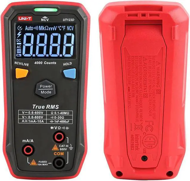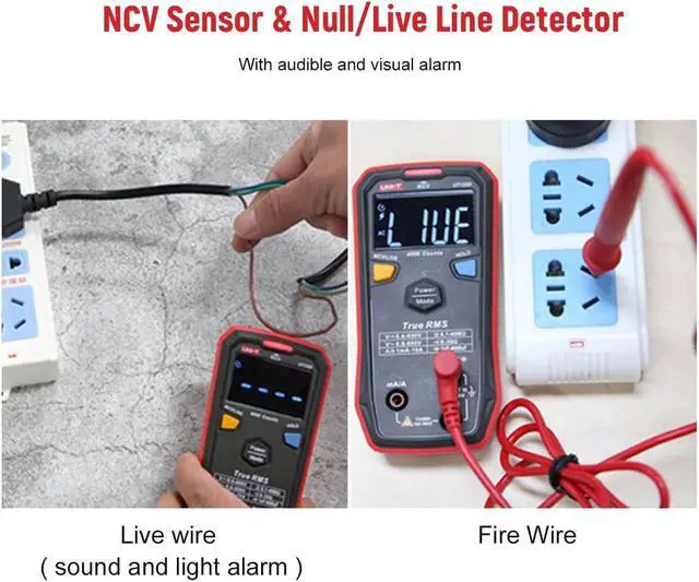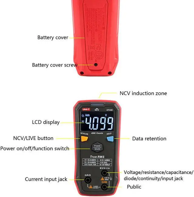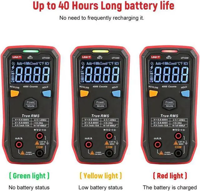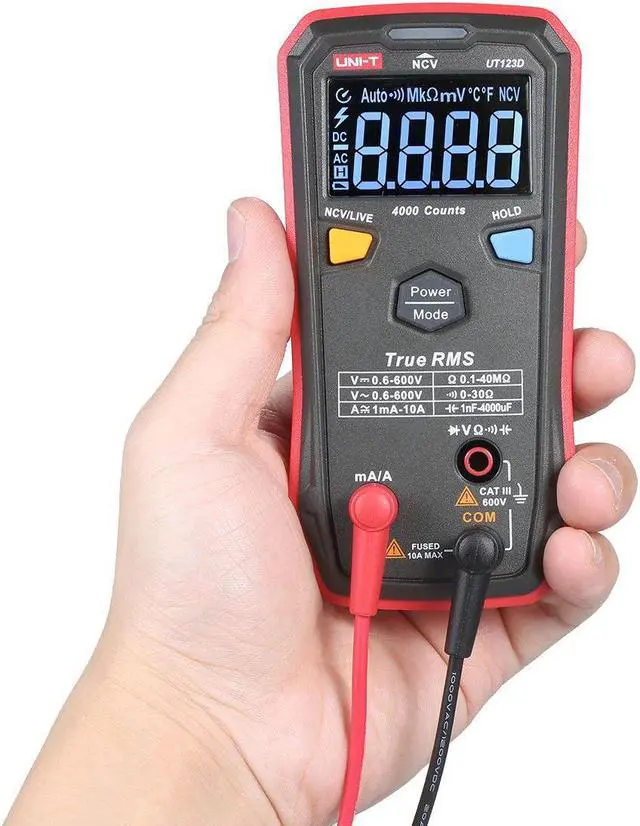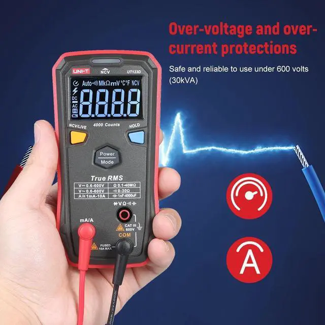 Features: Measures AC/DC voltage, AC/DC current, resistance, capacitance, diode, continuity, NCV, and live wire test. NCV sensor and live wire tester send out audible and visual alarm once AC voltage detected. Supports 4mF (4000uF) large capacitance measurement. Offers you with auto-ranging and manual ranging mode for extremely simple and effective using experience. Large EBTN display with backlight enables you to view readings clearly even in the dim light. Long battery life, the meter can last up to 40 hours, no need to frequently recharging it. Auto power off within 15 minutes if there is no operation, helps conserve the battery. Provides with overvoltage and overcurrent protections, safe and reliable to use under 600 volts (30kVA). More Functions - Low battery indicator and data hold.