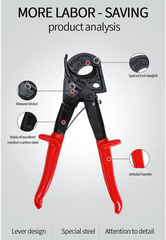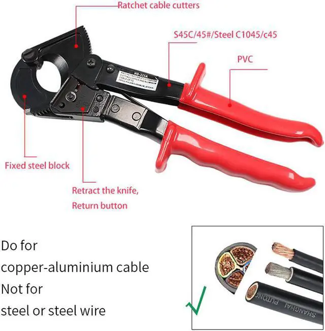 WX-325 Ratchet Type Cable CutterItem Mo.: WX-325Cutting Range: 240mm maxLength: 270mmWeight: 0.78KG Cutting range: WX- 325: 240 mm max. Cutting easily with forging blade and long lifetimeNot for cutting steel or steel wireWith safety lock
