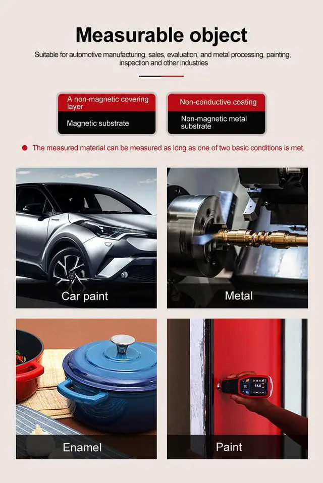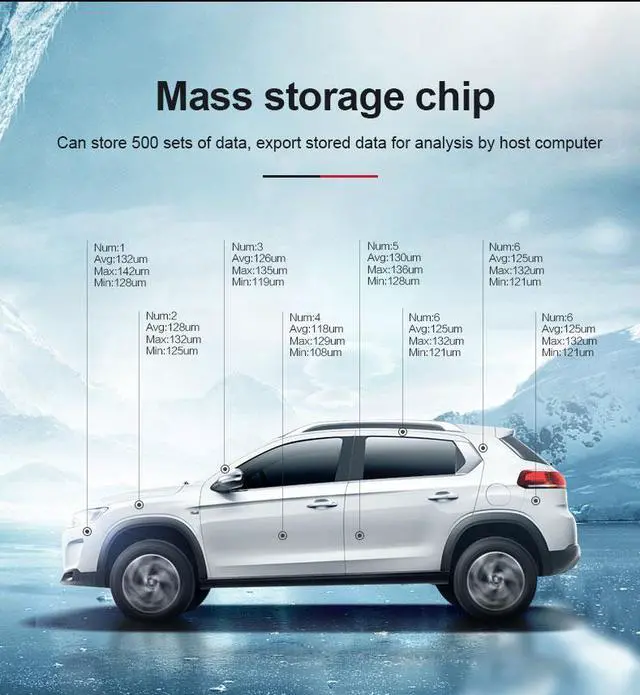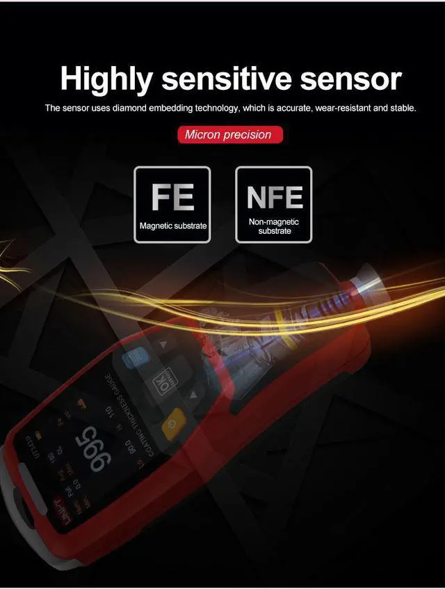 Features: Automatic identification of iron and non-ferrous substratesThe sensor uses diamond clamping technology, which is accurate, wear-resistant and stable. Single point and two point calibration to ensure measurement accuracySingle point, multi-point quick judgment and promptRed, green and yellow warning lightsThe screen display content is automatically rotated500 sets of storage data and USB data transmissionPlease notice battery is not included