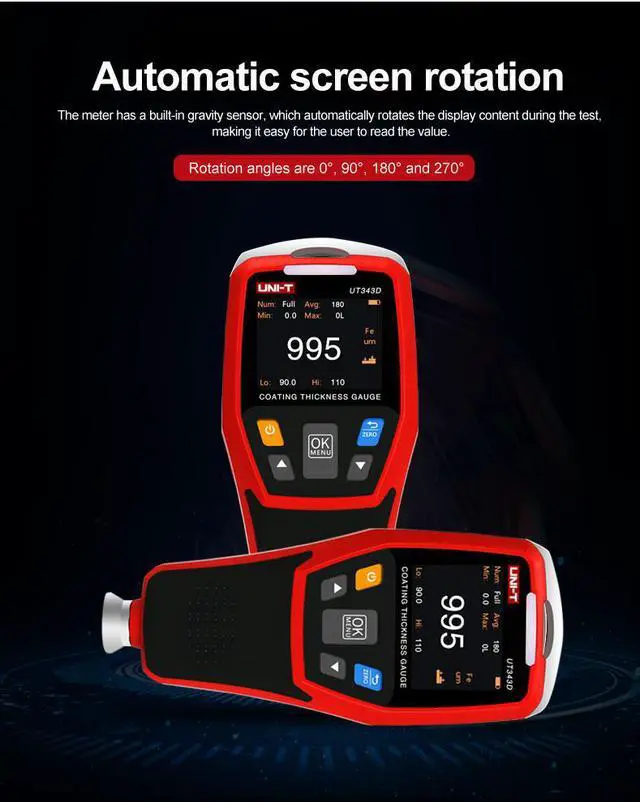 UNI-T UT343D Coating Thickness Gauge LCD Backlight 320 x 240 Pixels Digital FE/NFE Metal Car Paint Thickness Tester MeterUT343D coating thickness gauge is a high performance Thickness Gauge, can measure coating thickness on ferrous (FE) and non-ferrous (NFE) materials. This device is designed with a unique quick test feature, which allows users to set thickness range and using a 3-color LED and audio alarm to quickly determine if coating being tested falls within the preset range, greatly increasing work efficiency. It is widely used in manufacturing, metal processing, aerospace, marine, motor train, scientific research, quality inspection, etcUT343 display is auto rotatable.